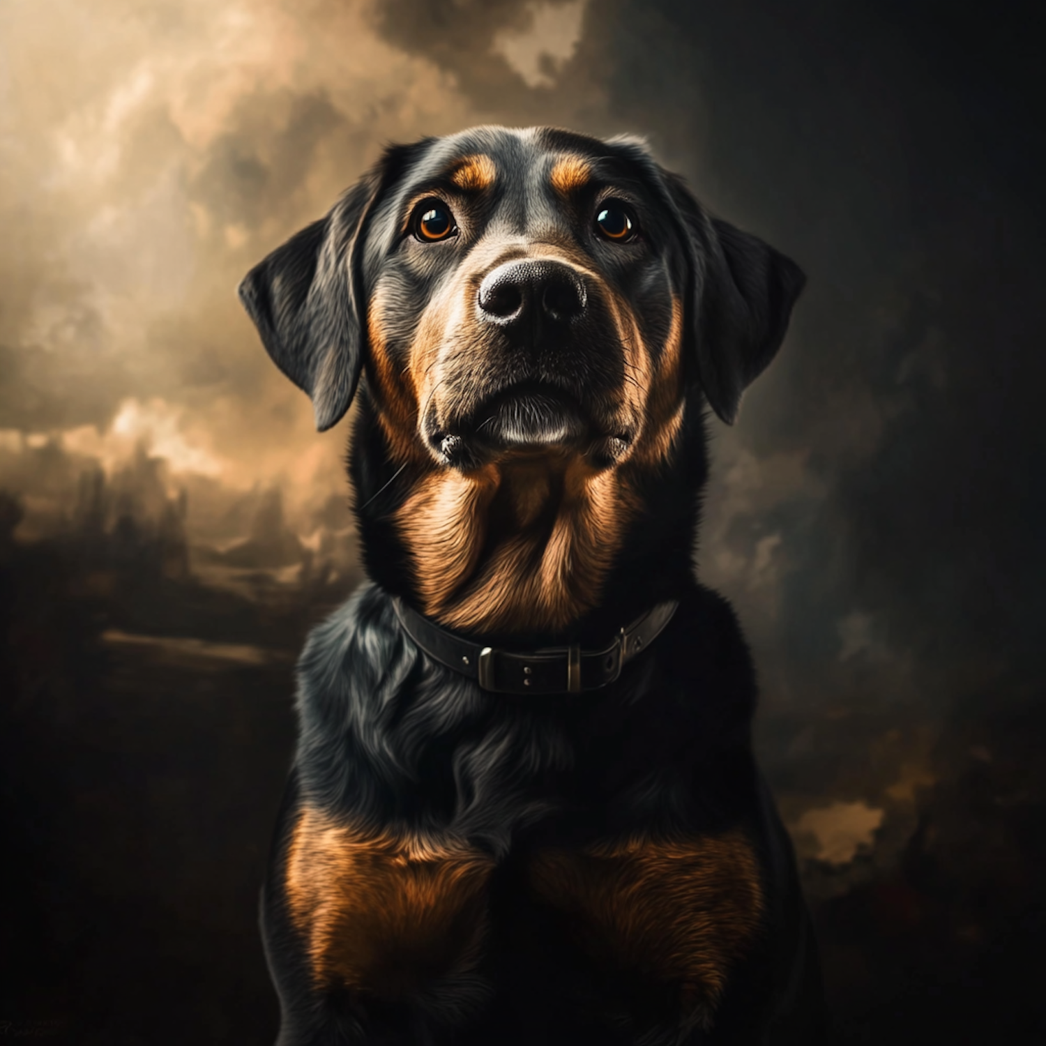 Majestic Rottweiler with sleek black and tan coat against a dramatic cloudy backdrop, exuding calm and nobility.