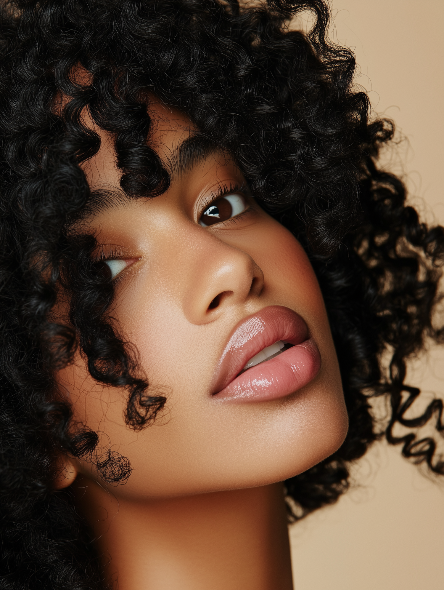 Close-up portrait of a woman with curly black hair, glossy lips, and serene expression against a beige background.