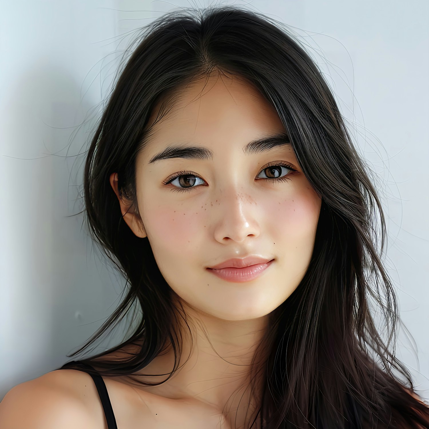 Portrait of a young Asian woman with long dark hair and serene expression, wearing a black top against a neutral background.