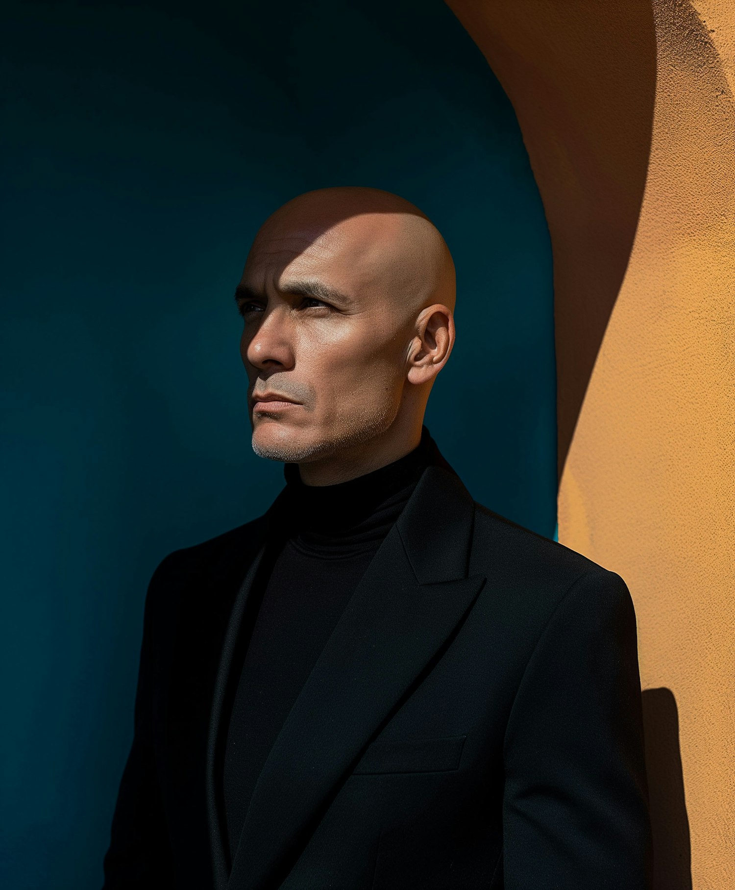 Bald man in black turtleneck and blazer, standing against a teal and orange background, with dramatic lighting and shadows.