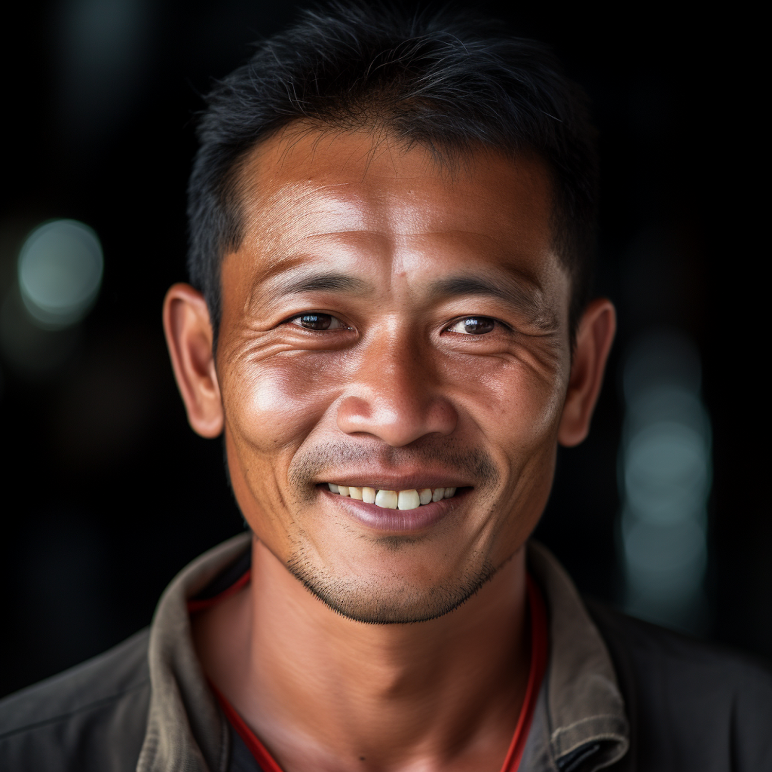 Smiling Asian man with short black hair and warm brown skin, wearing a dark jacket. Friendly expression with a blurred background.