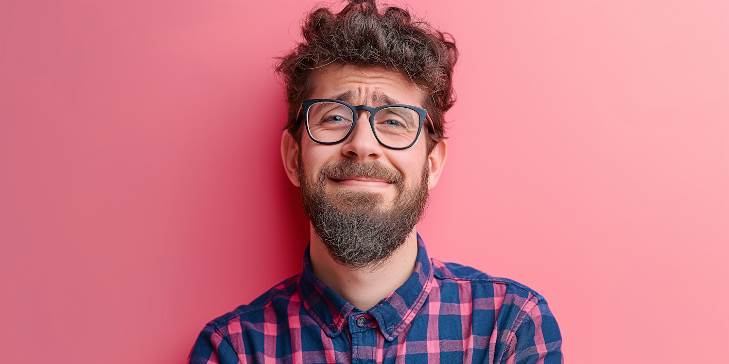 Caucasian man with curly hair and beard, wearing glasses and a checkered shirt, stands against a pink background with a playful expression.