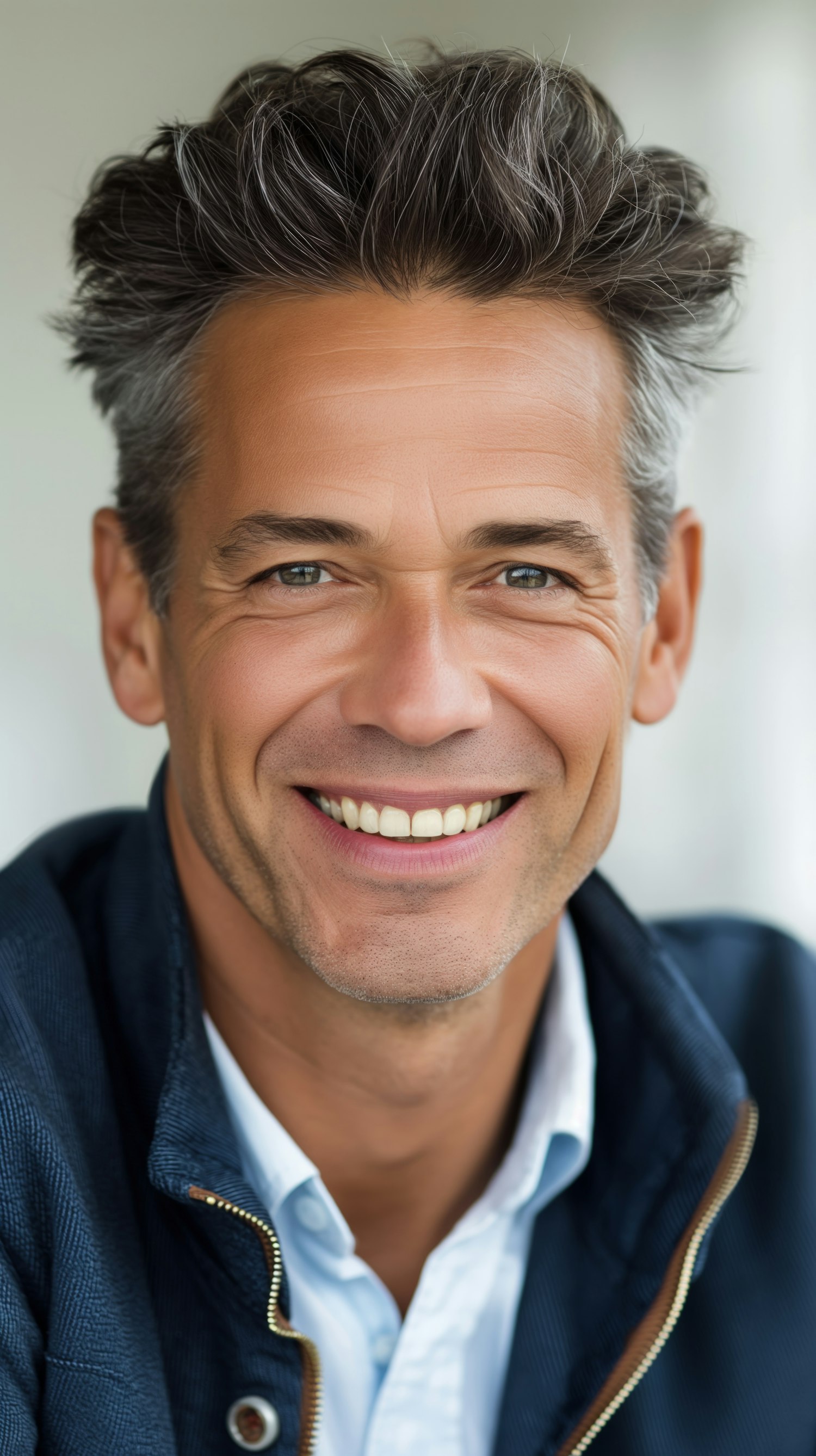 Middle-aged man with salt-and-pepper hair, wearing a blue jacket and white shirt, smiling warmly with a friendly expression.