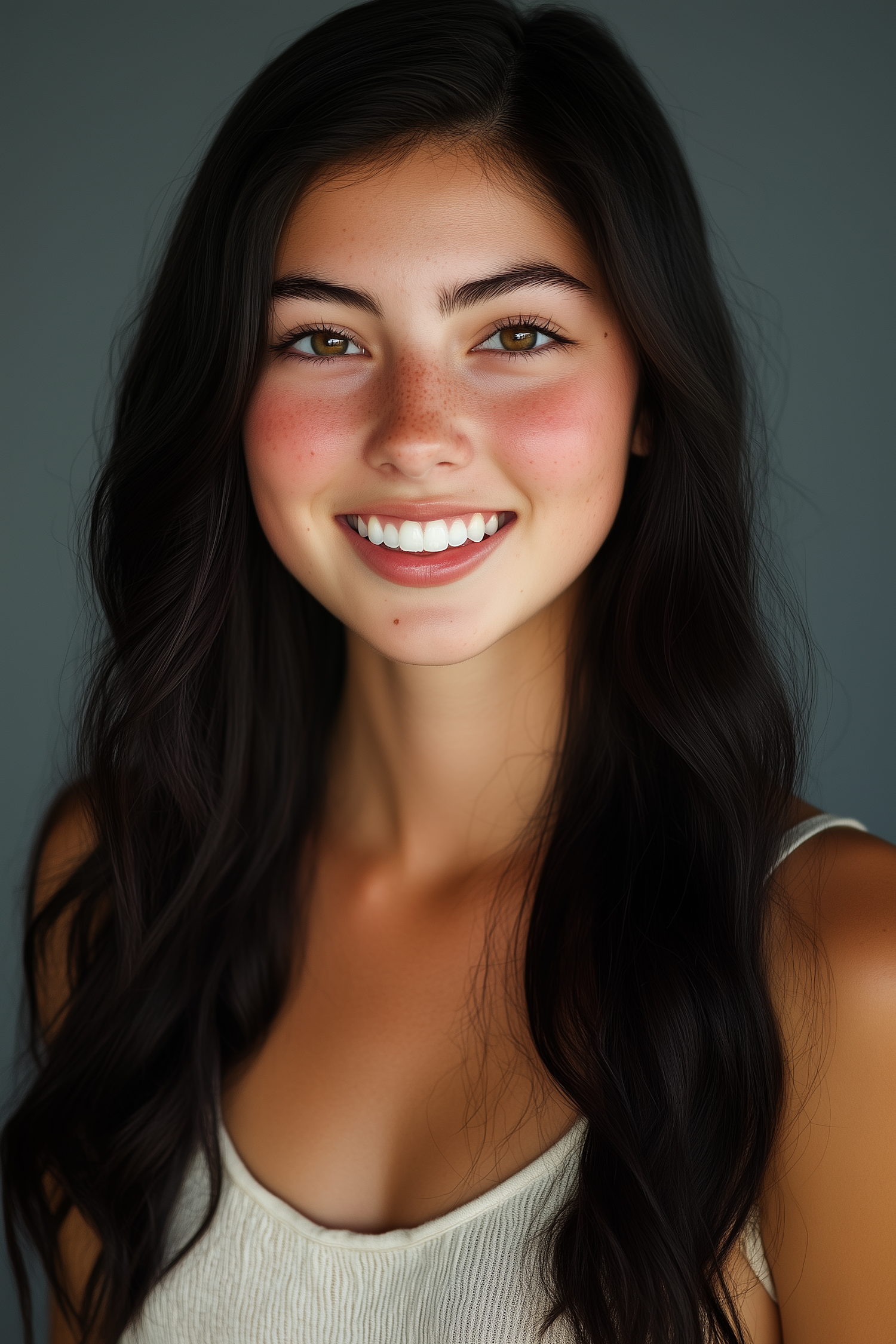 Young woman with long black hair, hazel eyes, and freckles, smiling warmly against a gray background.