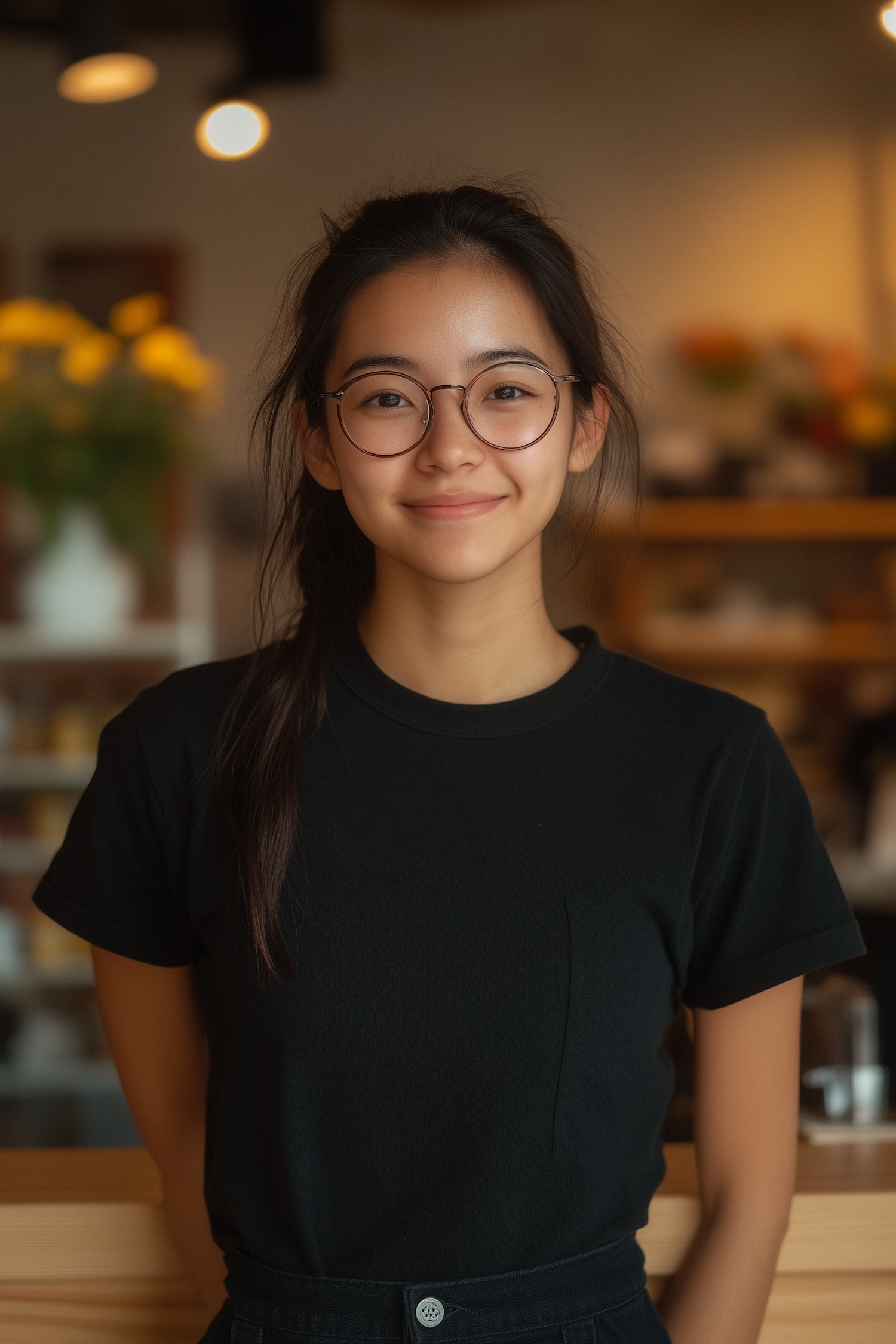 Asian woman with glasses and black t-shirt smiling indoors with warm lighting and blurred background.