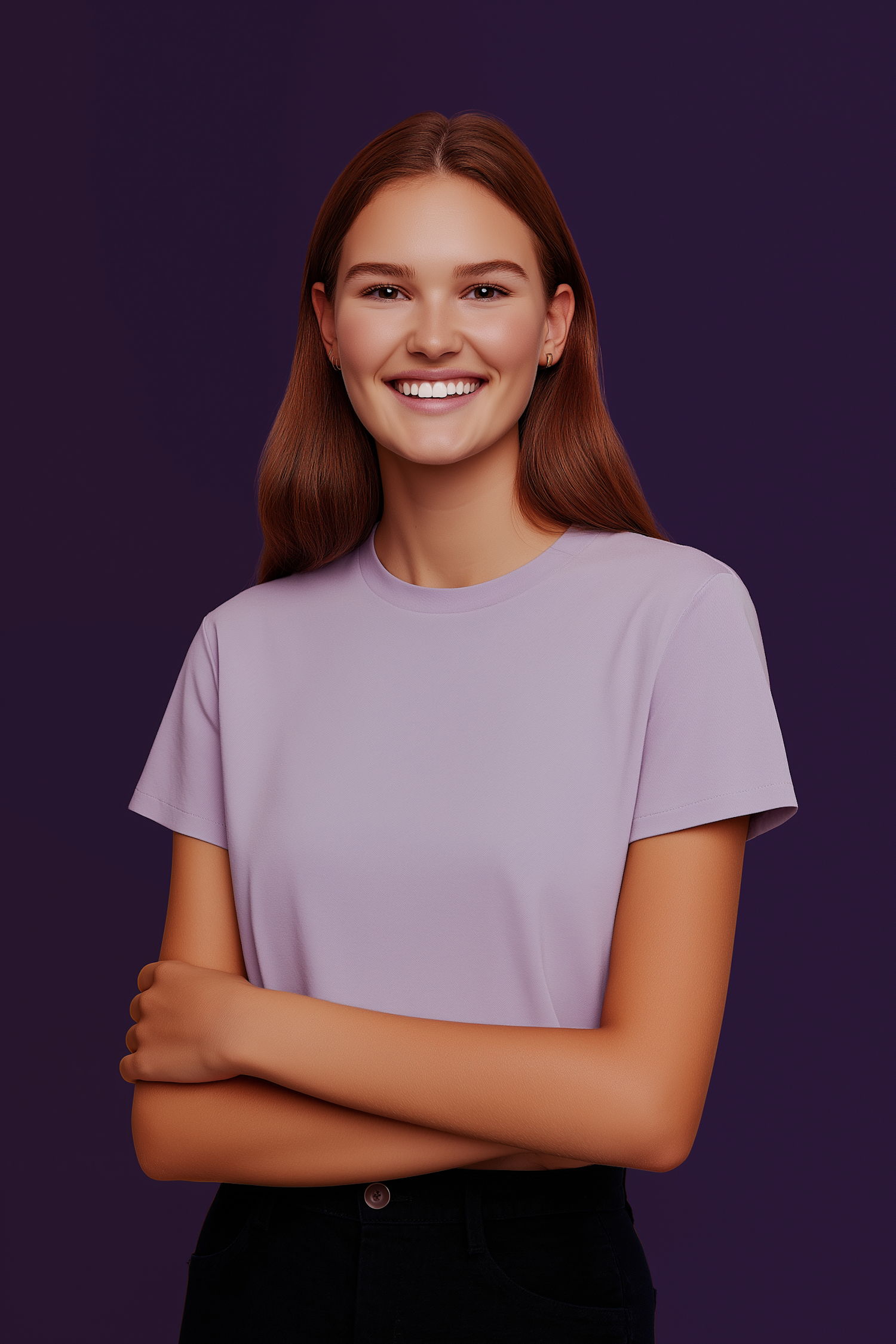 Smiling young woman with auburn hair in a lavender t-shirt against a purple background, exuding warmth and confidence.