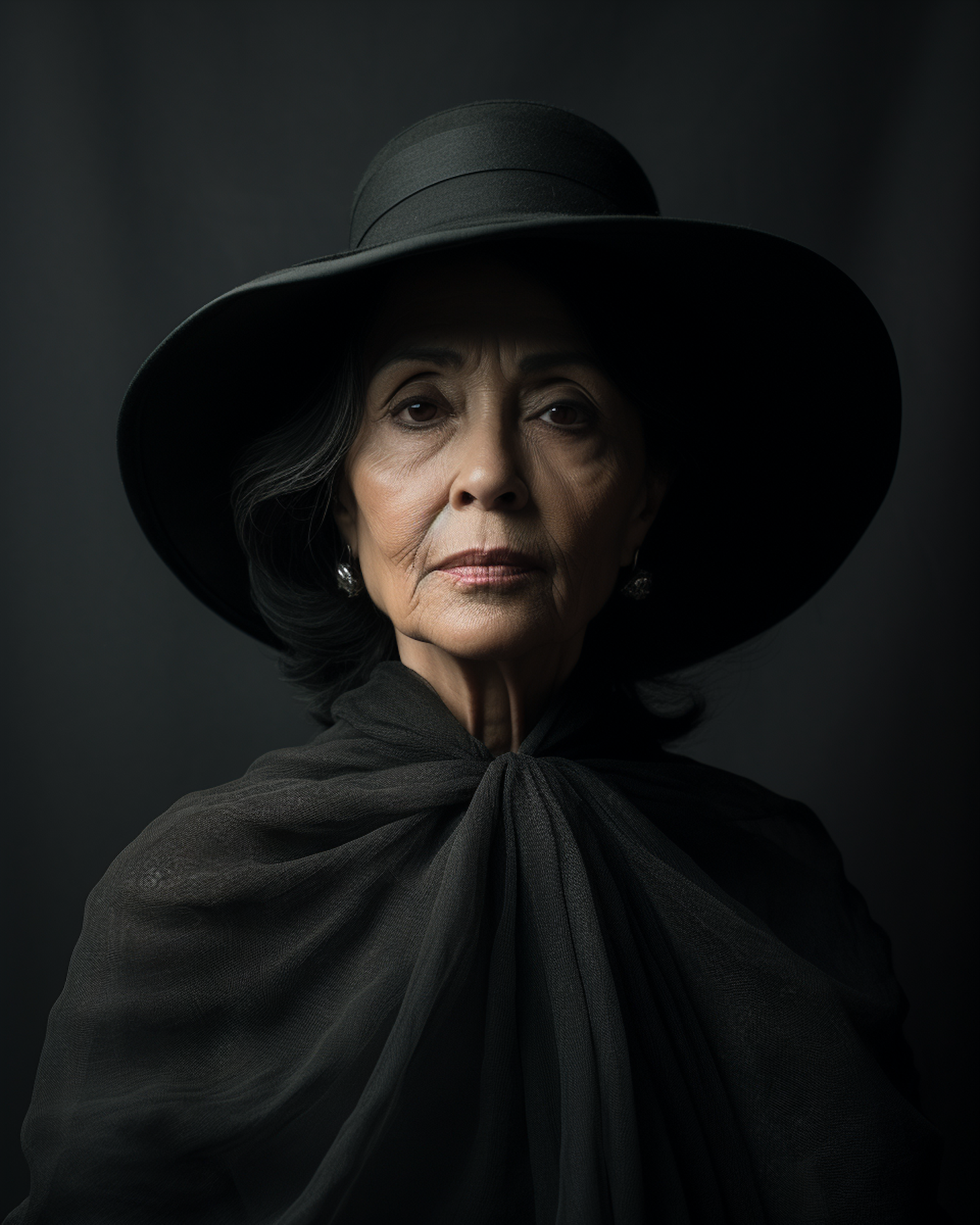 Elegant elderly woman in a black hat and sheer fabric, exuding grace and sophistication against a dark background.