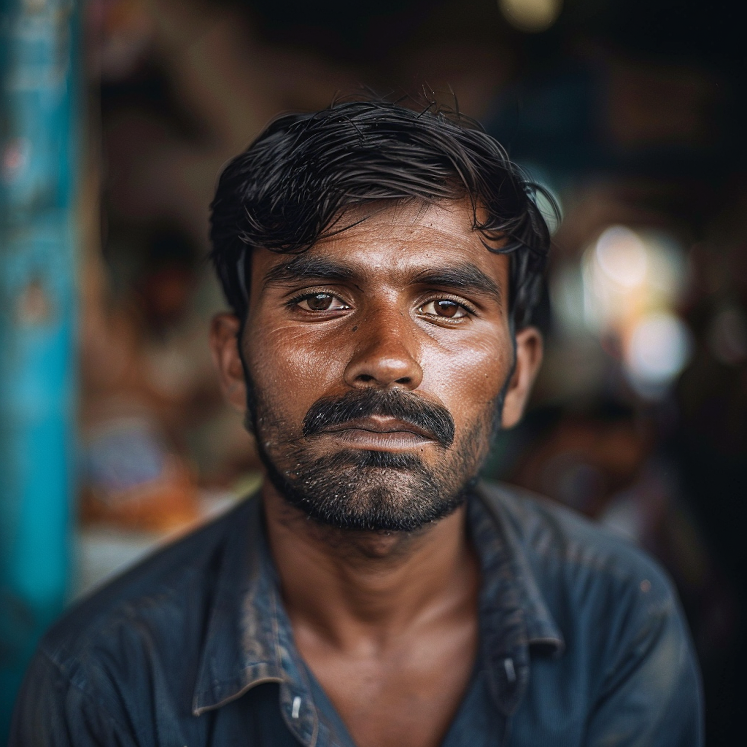 Portrait of a man with dark hair and beard, wearing a blue shirt, set against a blurred background. Introspective expression.