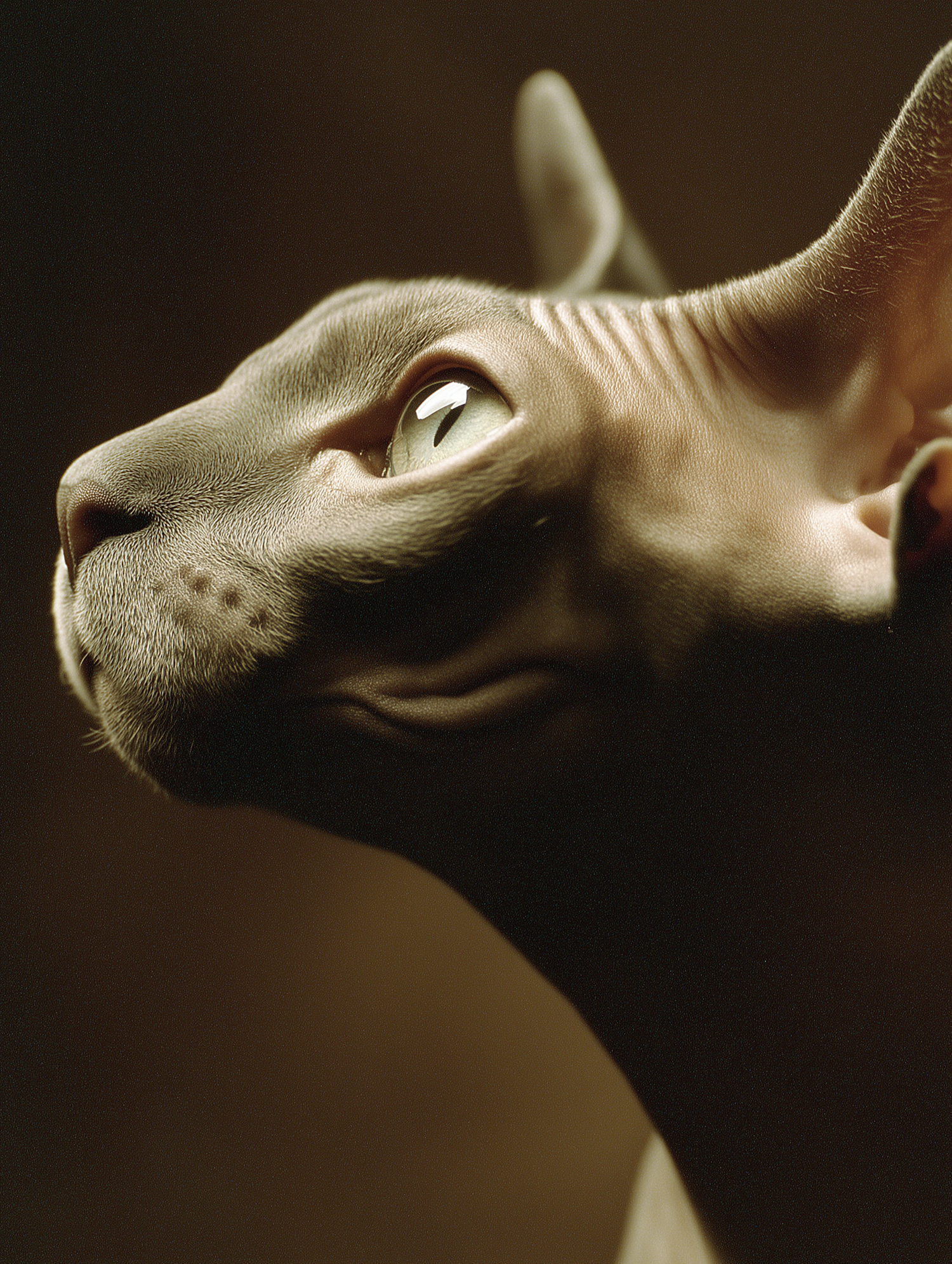 A close-up photograph of a grey Sphynx cat, showcasing its textured skin, expressive green eye, and a warm, softly-lit atmosphere.