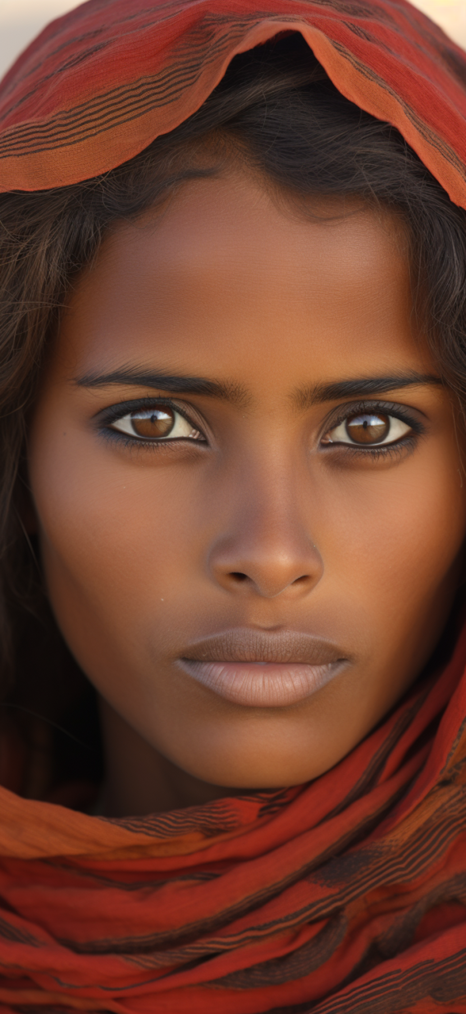 Close-up portrait of a woman with brown skin, striking eyes, and an orange patterned scarf, exuding confidence and elegance.
