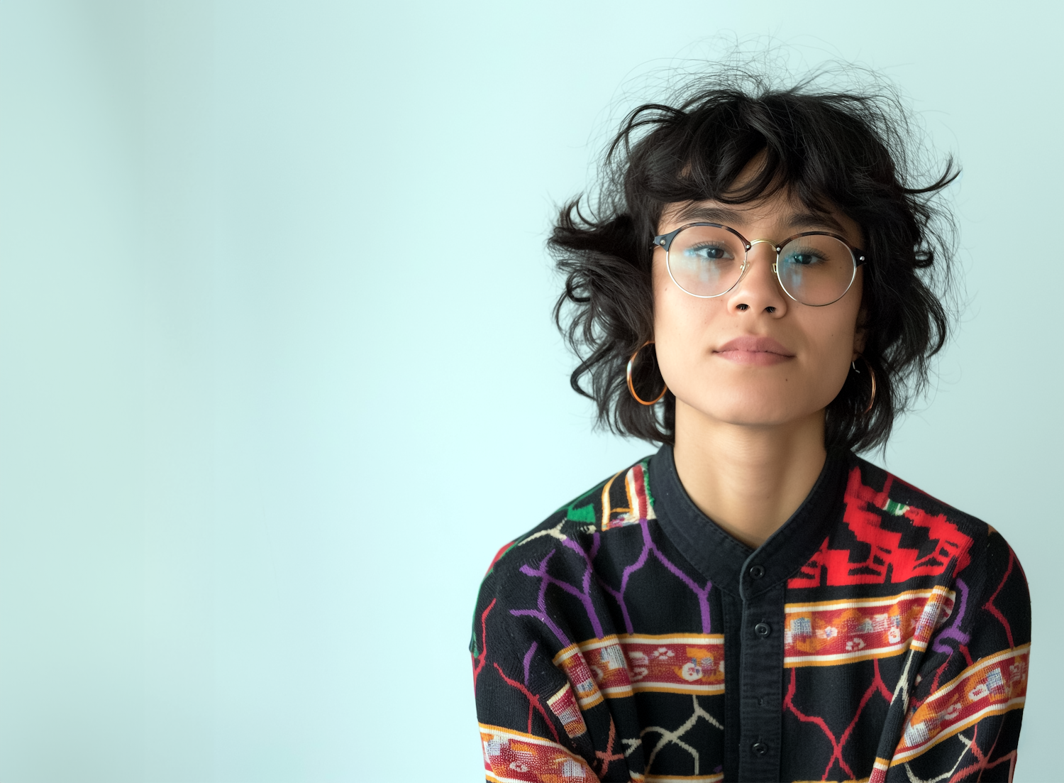 Asian individual with glasses and hoop earrings in a colorful geometric shirt against a pale blue background.
