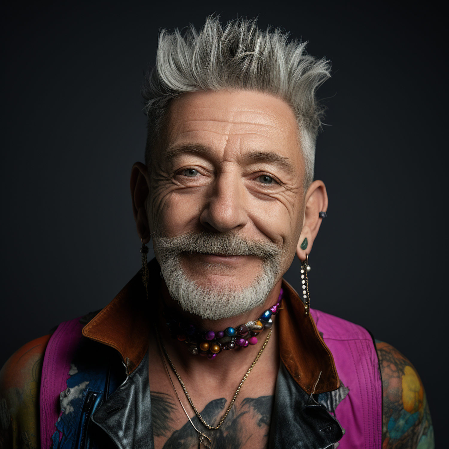 Stylish older man with spiky gray hair, colorful beads, and tattoos, wearing a pink and black leather jacket against a dark background.