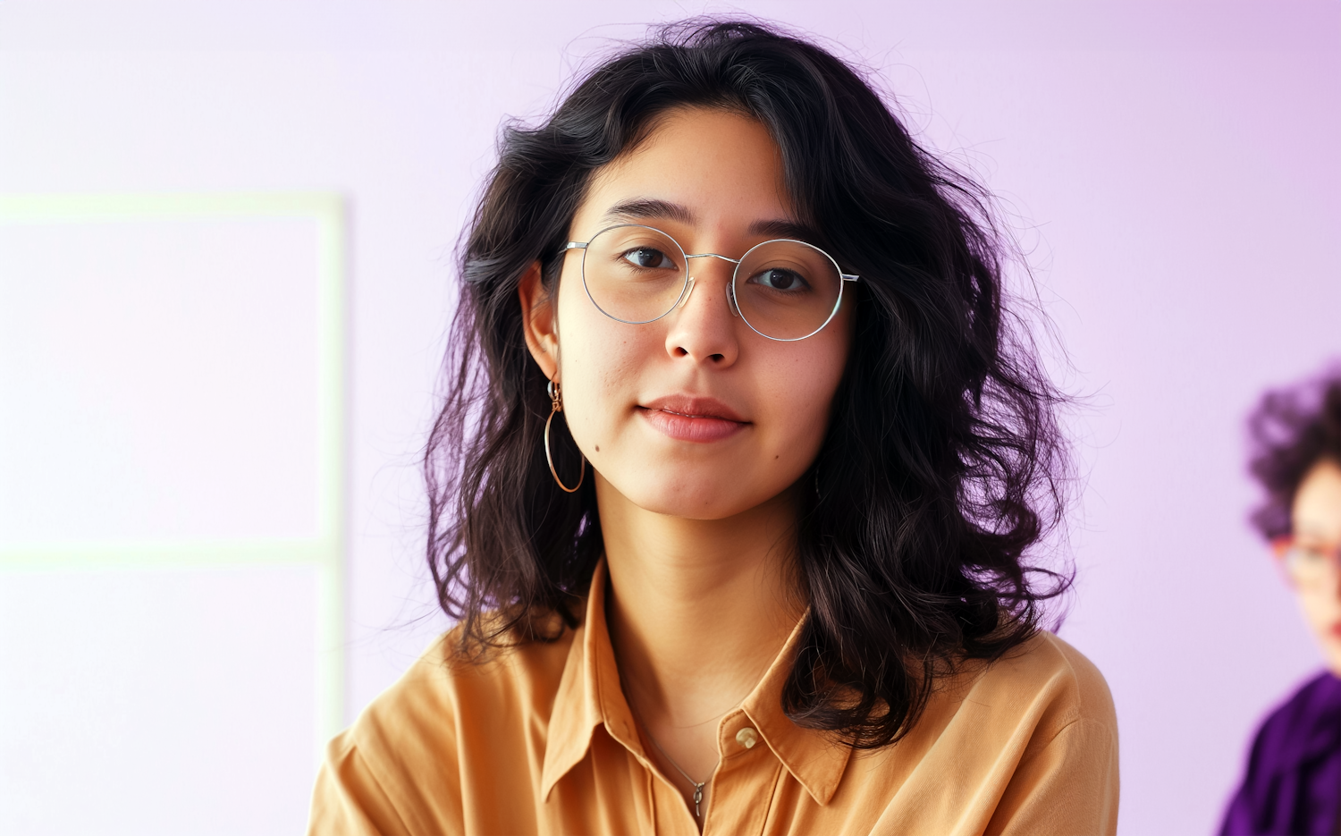 Young woman with wavy black hair, round glasses, and hoop earrings against a lavender background. Calm expression and light brown shirt.