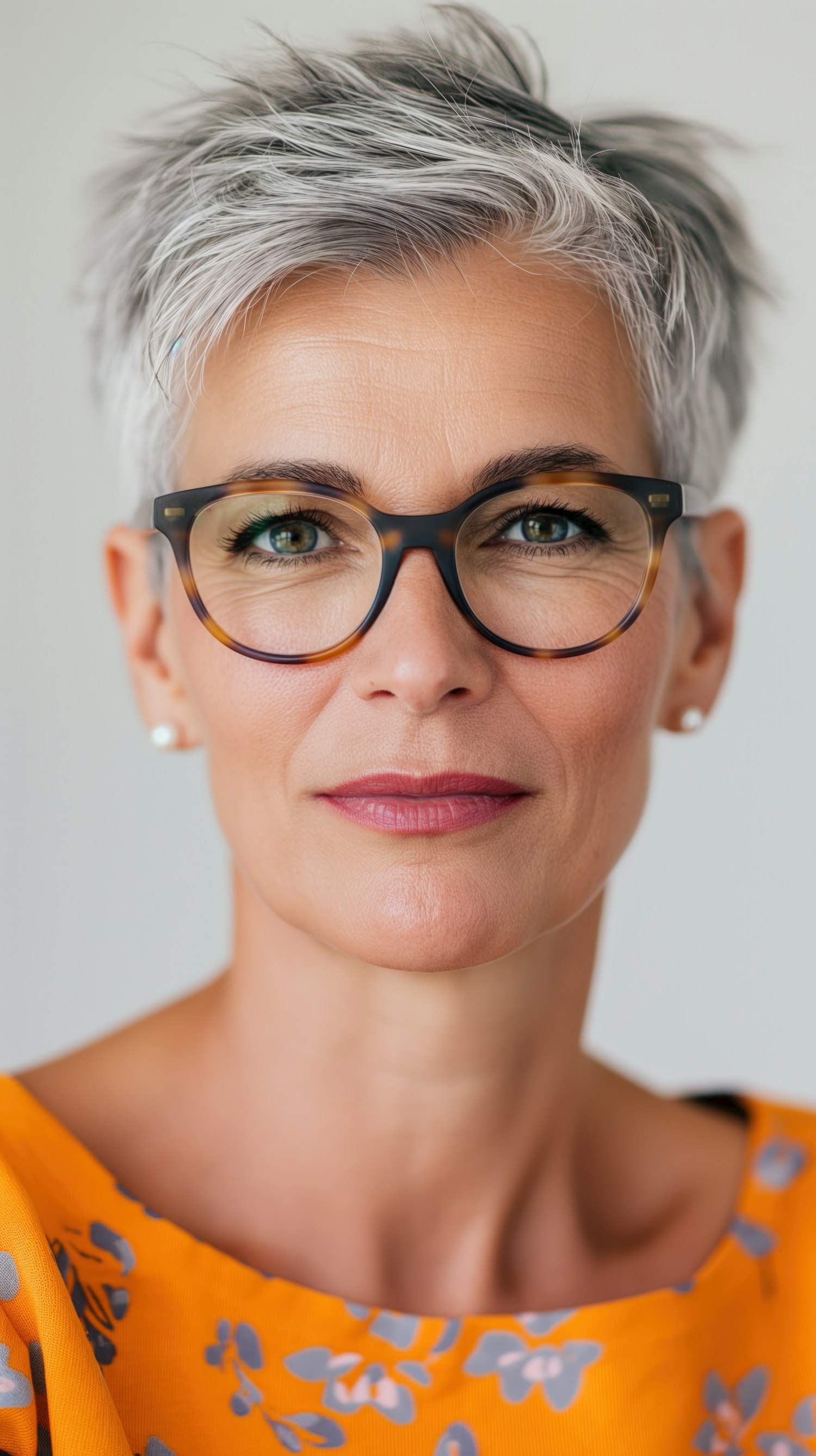 Confident middle-aged woman with gray hair and glasses, wearing a vibrant orange floral top. Elegant and composed expression.