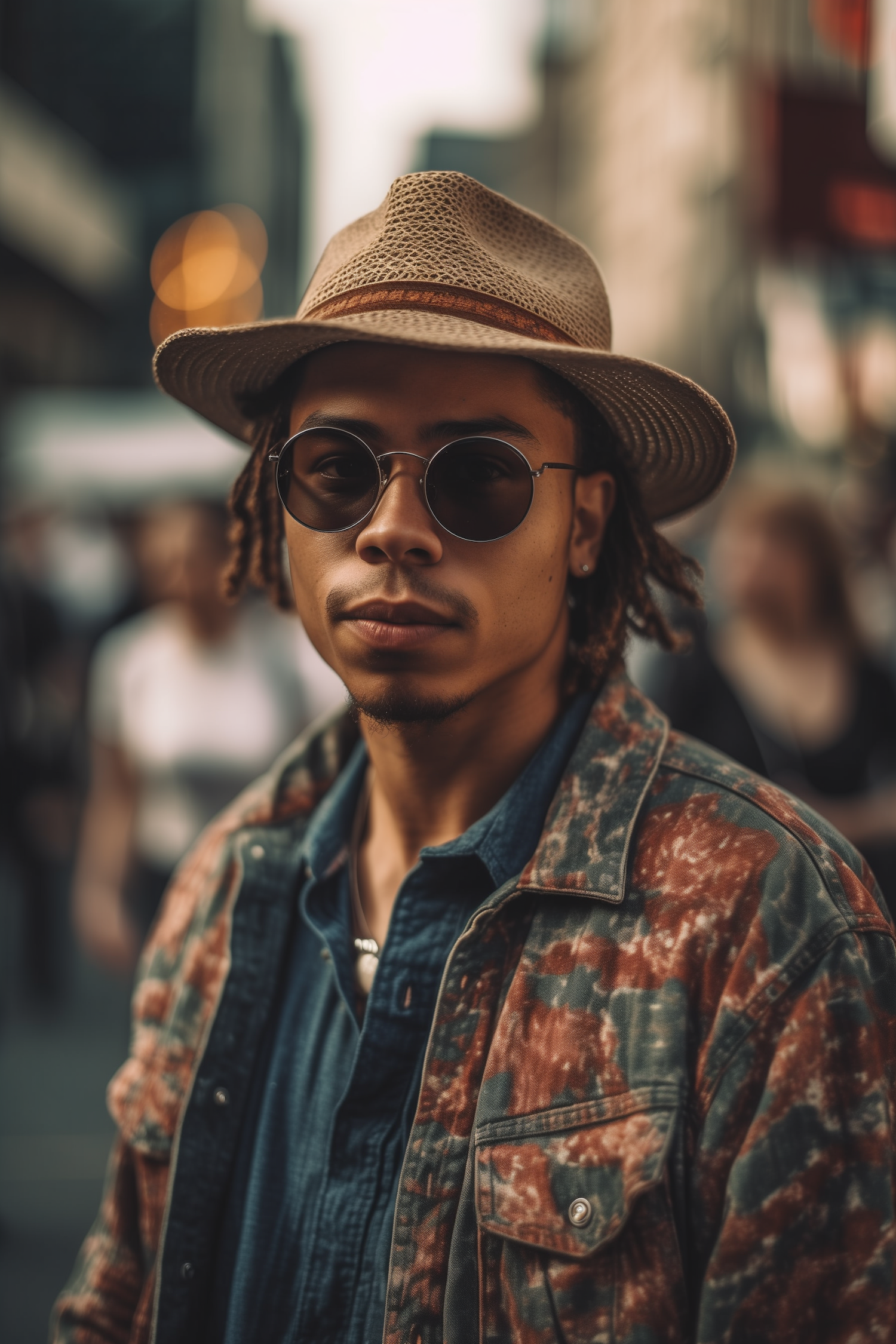 Stylish young man in a straw hat and sunglasses, wearing a patterned jacket, stands confidently in a bustling city street.