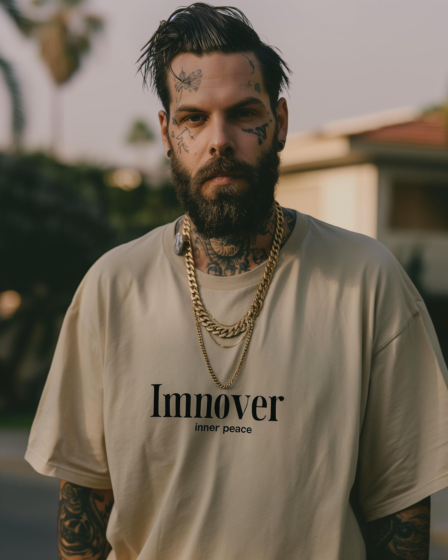 Caucasian man with facial tattoos, beard, and gold chains wearing a beige 'Imnover inner peace' t-shirt in a suburban setting.