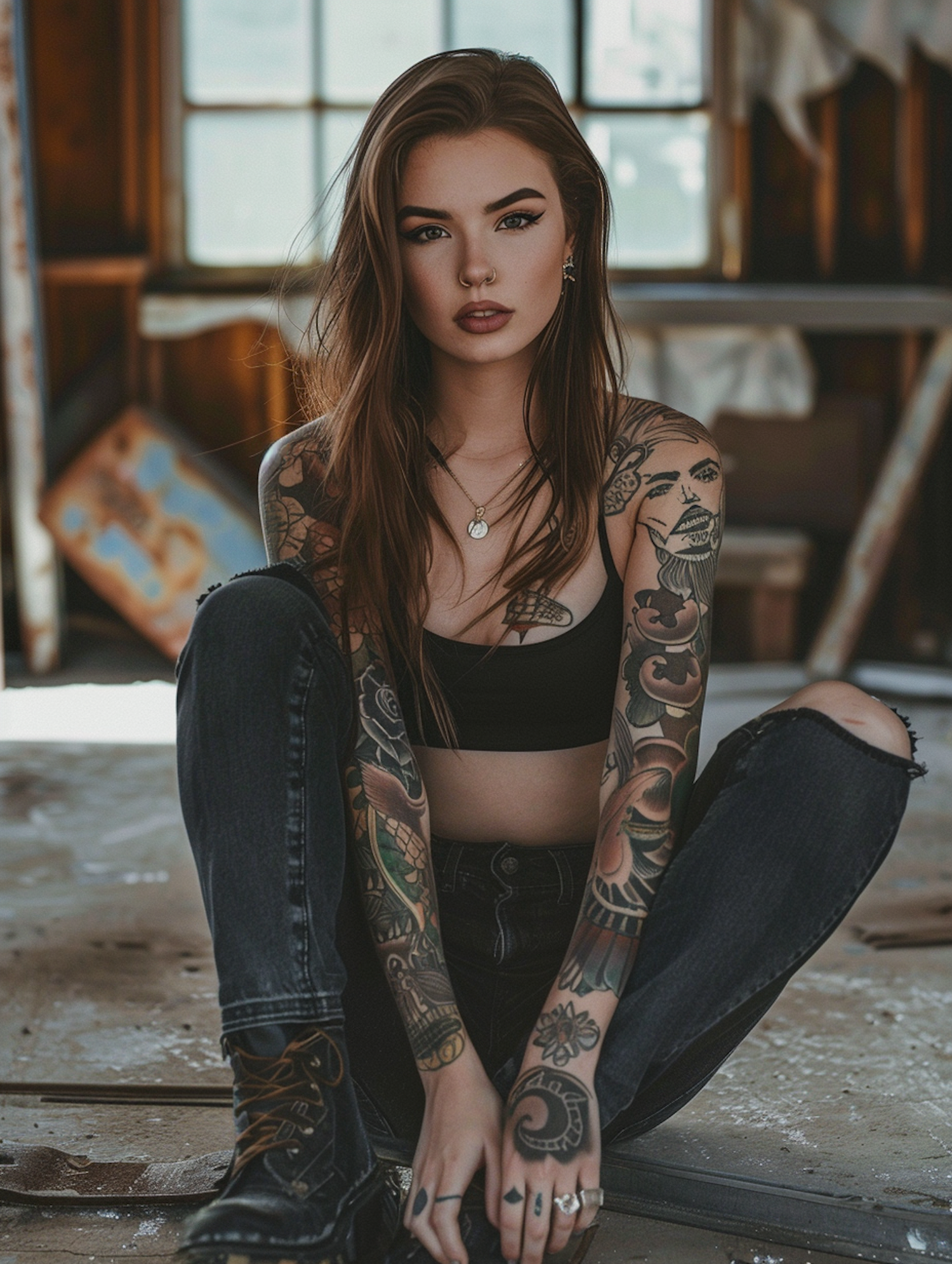 Young woman with tattoos sits in a rustic room, wearing a black crop top and jeans. Her confident expression and vibrant tattoos stand out.