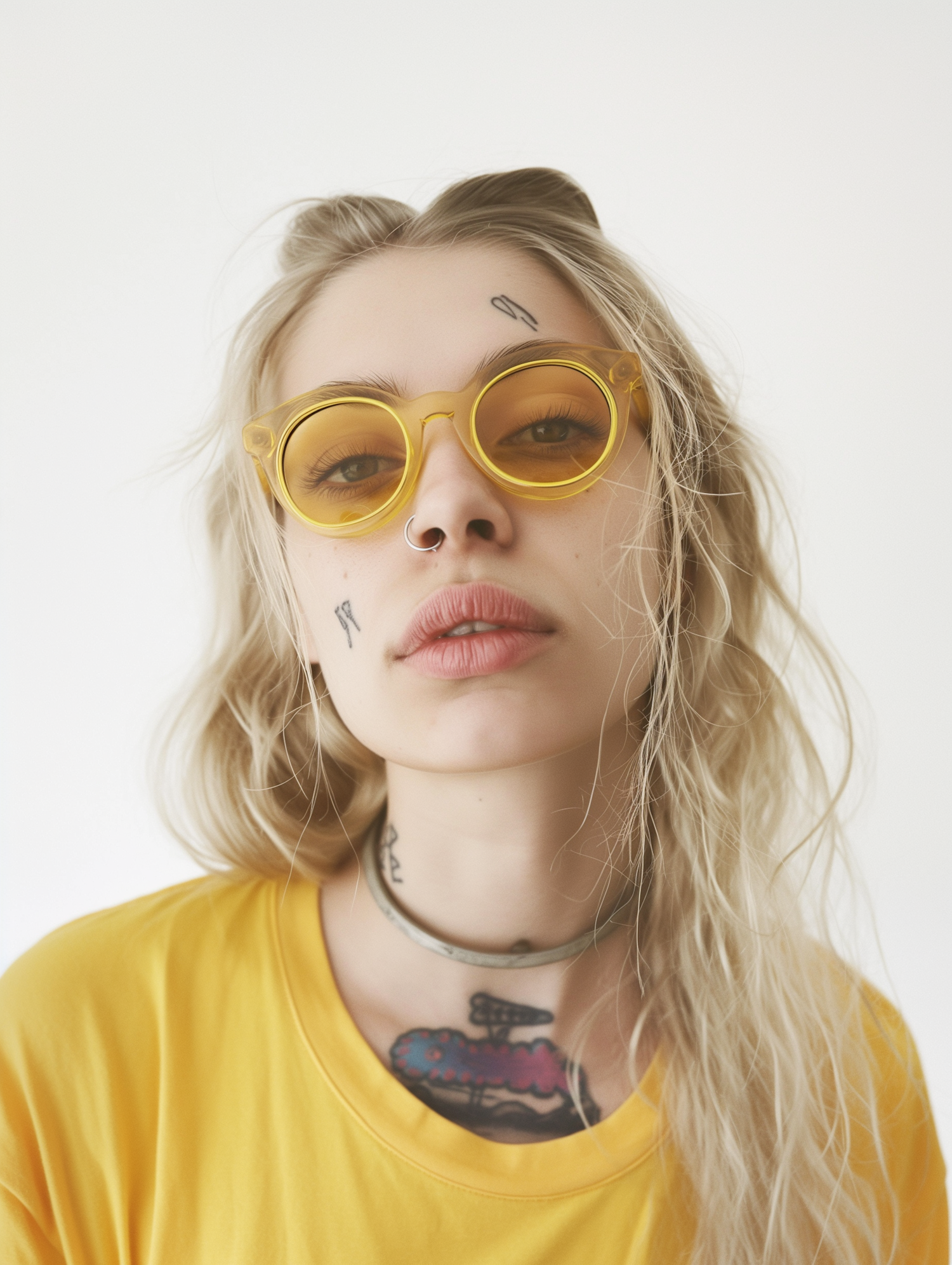 Stylish woman with yellow sunglasses, face tattoos, and a choker, wearing a bright yellow shirt against a plain background.