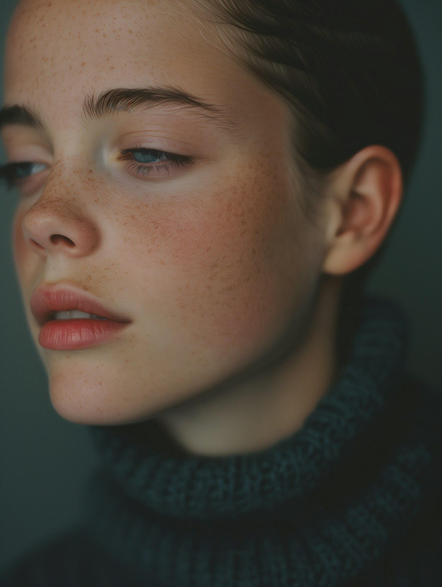 Close-up portrait of a young woman with freckles, blue eyes, and dark hair, wearing a dark turtleneck. Soft lighting highlights her serene expression.