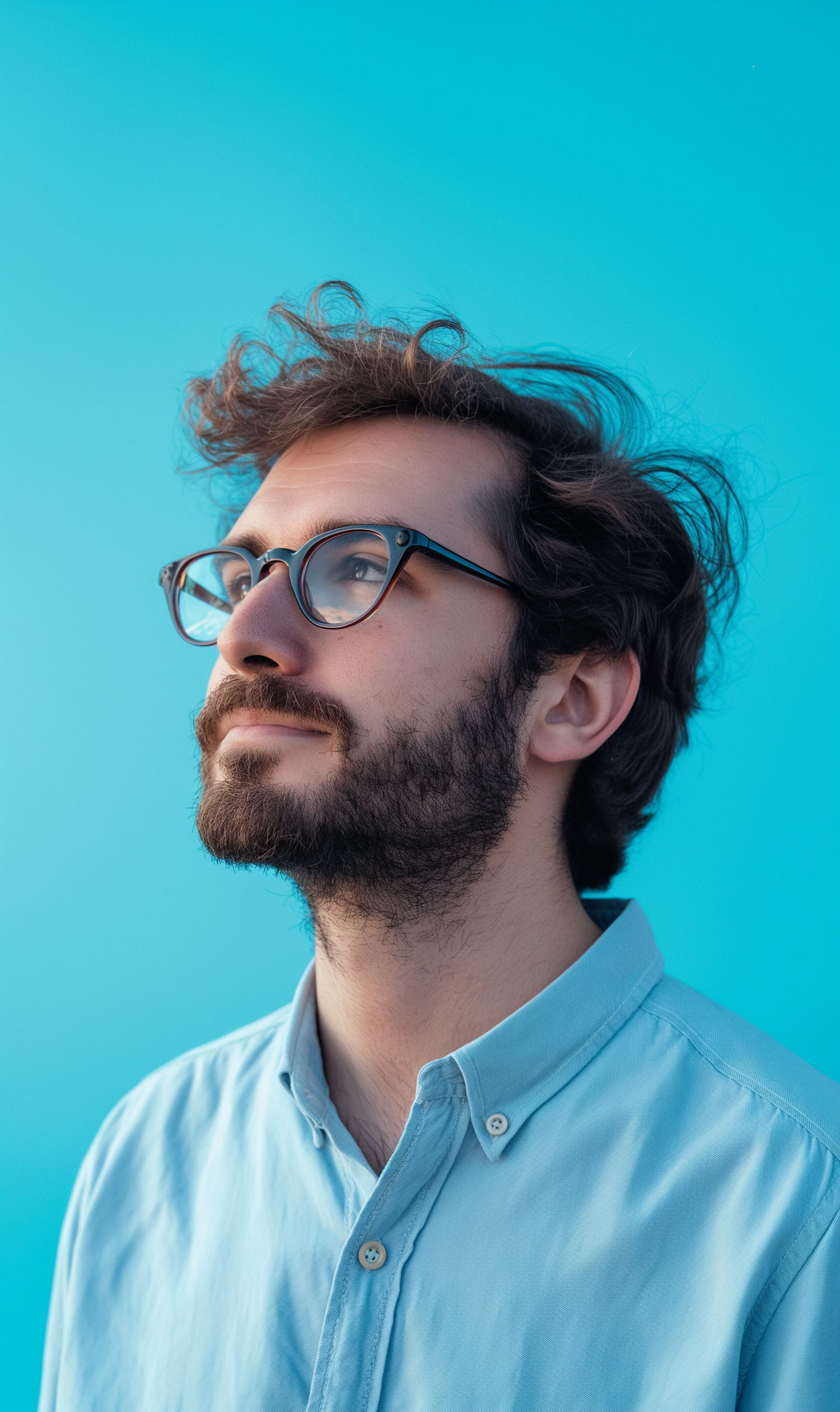 Thoughtful young man with glasses and beard gazing upward against a vibrant blue background, wearing a light blue shirt.