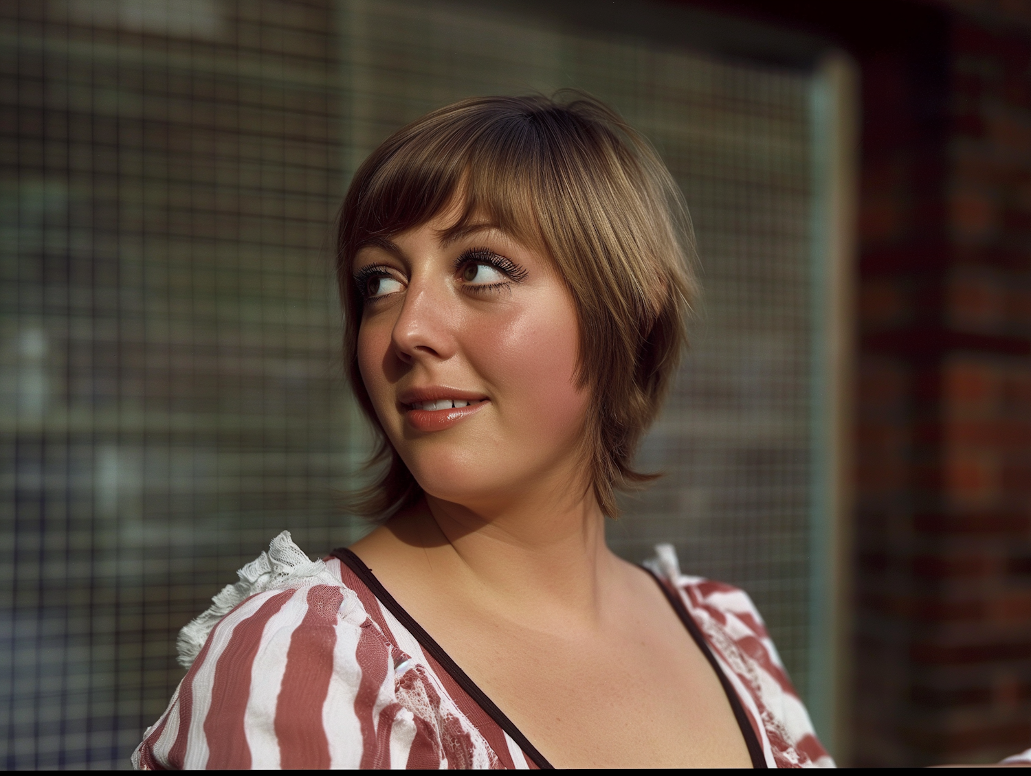 Young woman with short light brown hair and striped top, smiling softly against a blurred grid background.