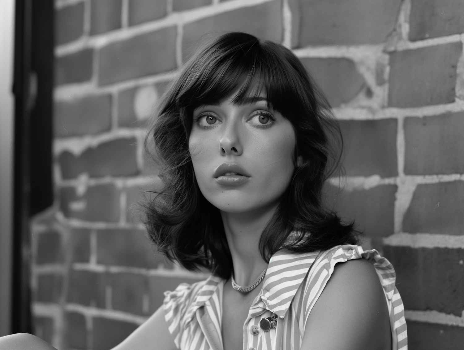 Black and white portrait of a young woman with dark hair and light eyes, wearing a striped blouse against a brick wall.