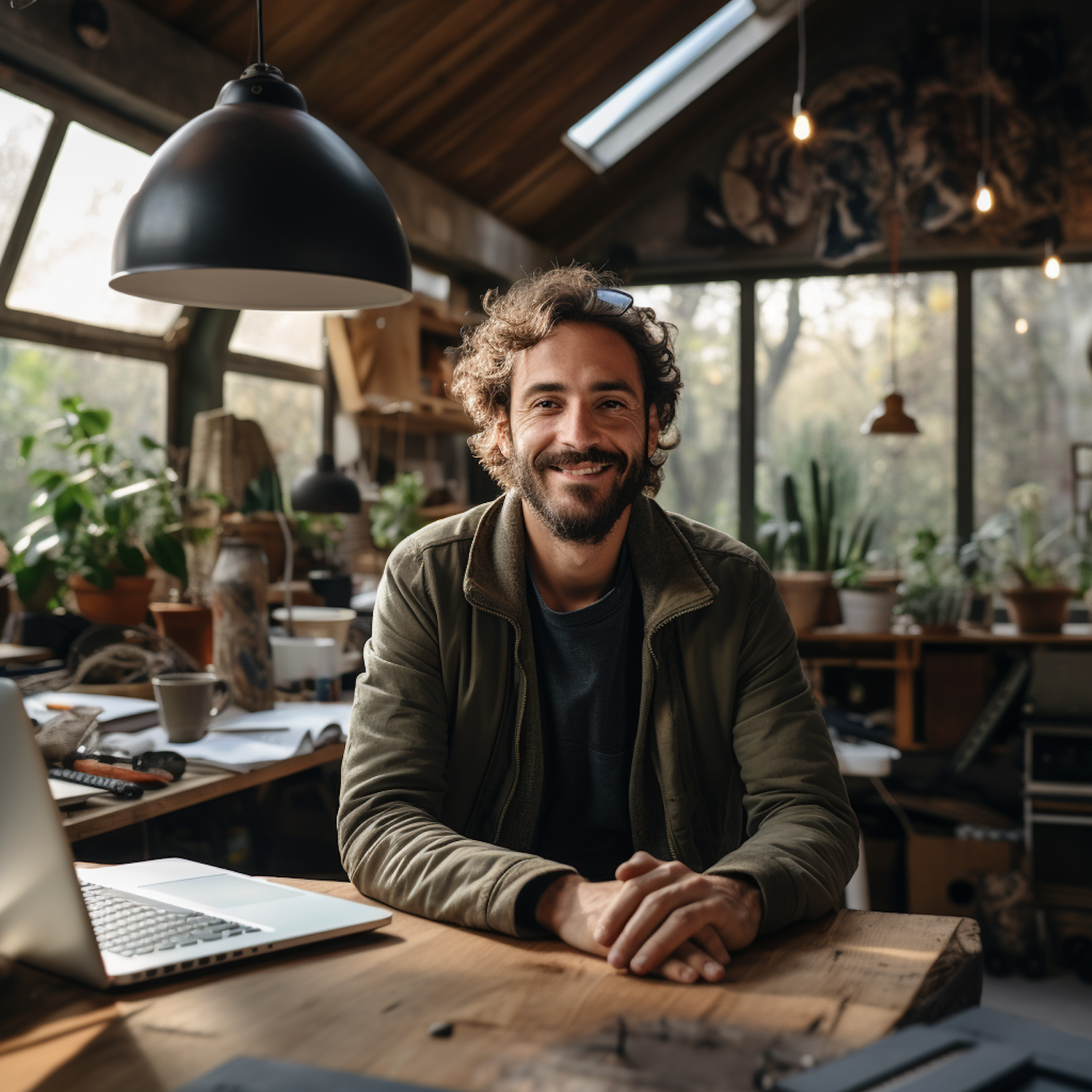 Caucasian man with curly hair and beard in a cozy, plant-filled room, smiling at a wooden table with a laptop.