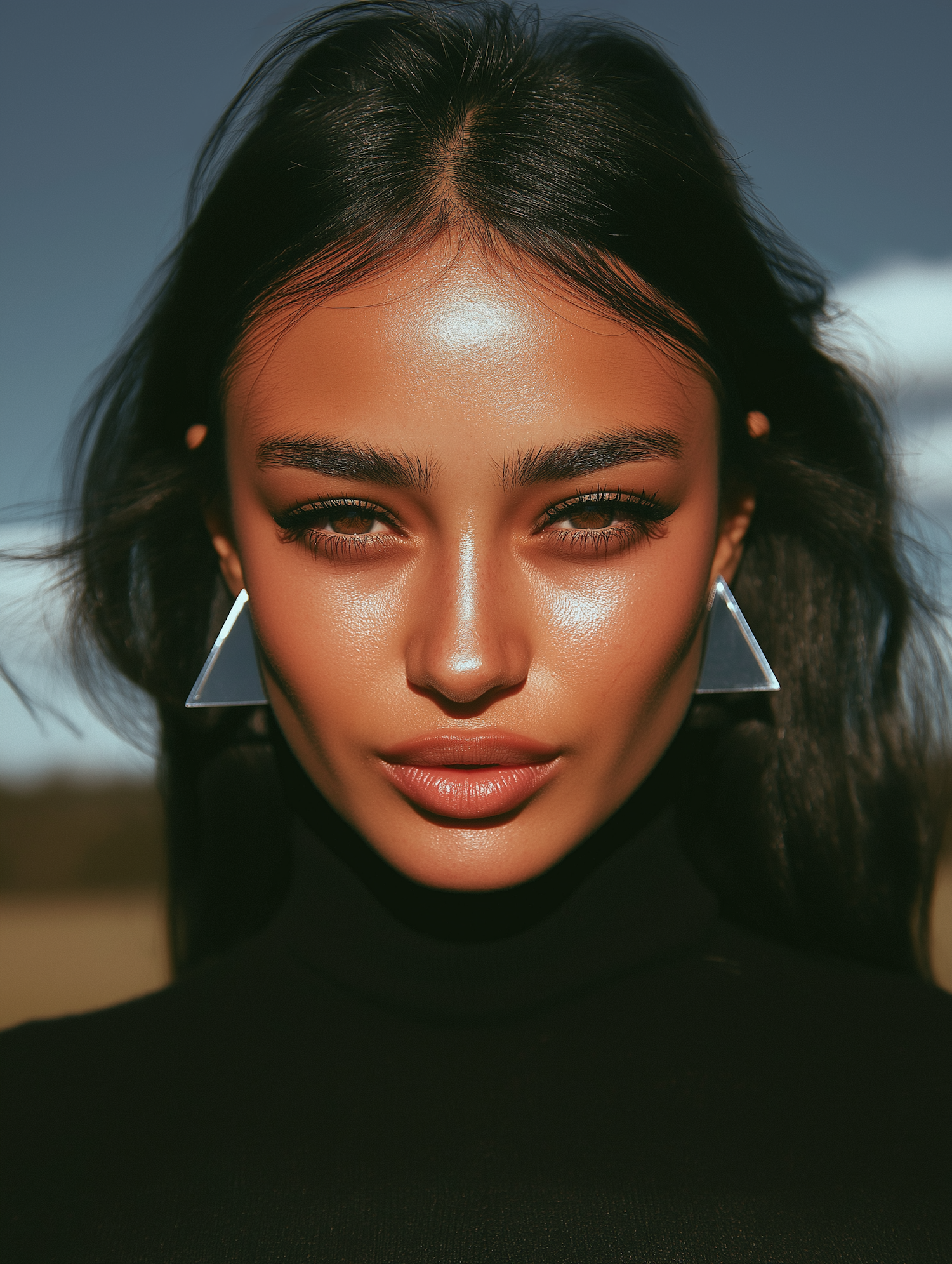 A striking portrait of a woman outdoors wearing a slick black turtleneck and modern earrings, captured under warm, natural lighting.
