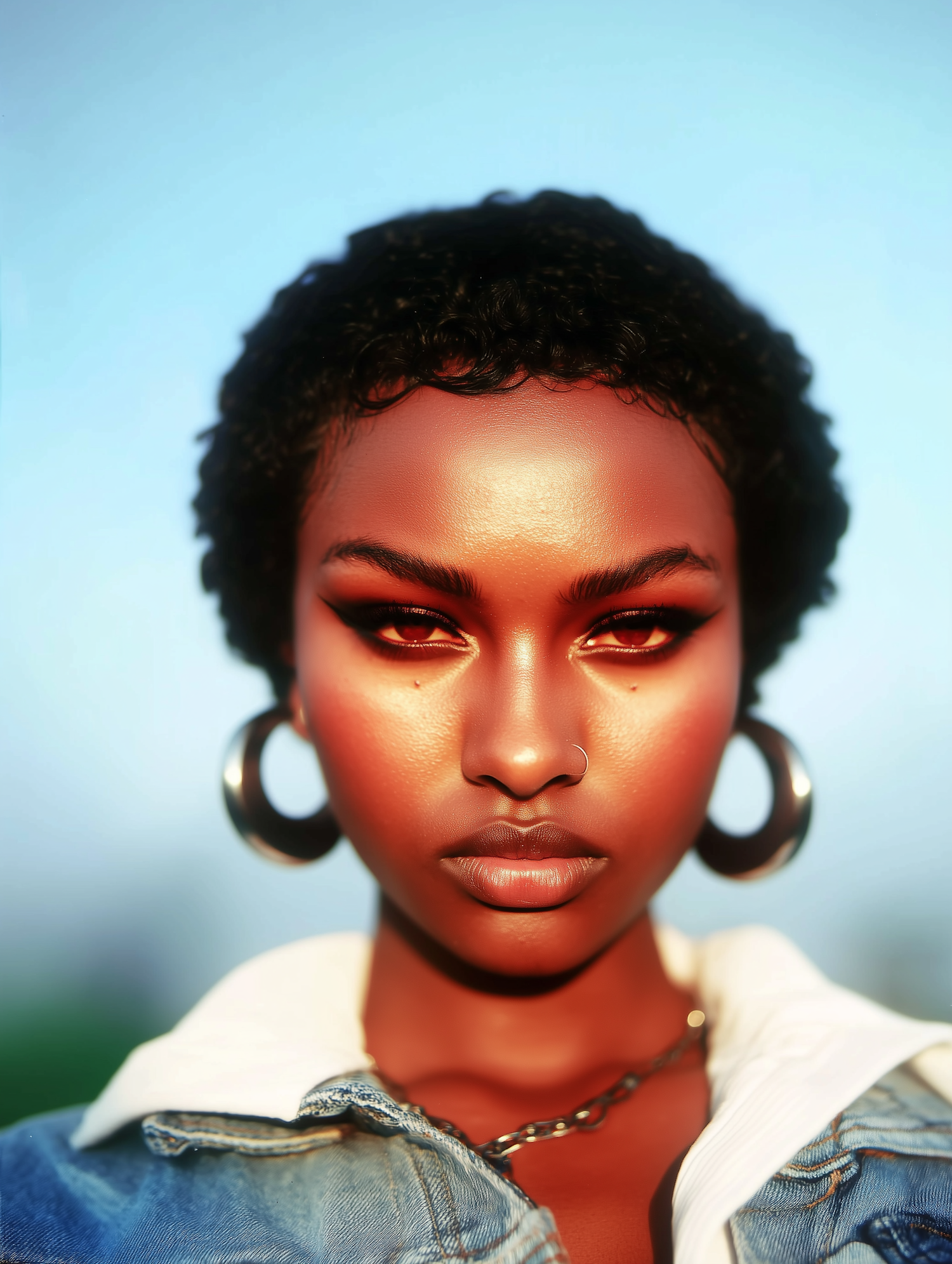 A striking close-up of a woman with natural curls, hoop earrings, and a denim outfit, set against a softly blurred background.