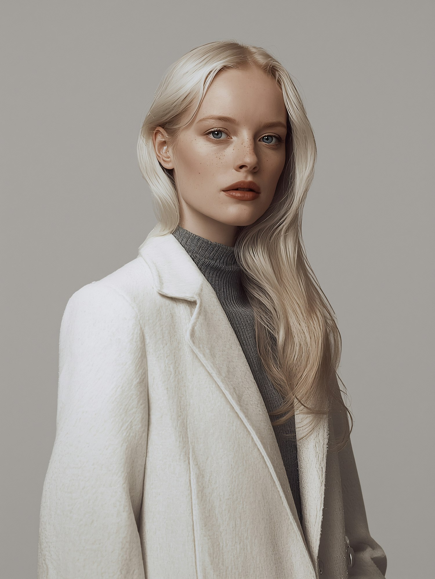 Elegant portrait of a woman with blonde hair in a white coat and gray turtleneck against a neutral gray background.