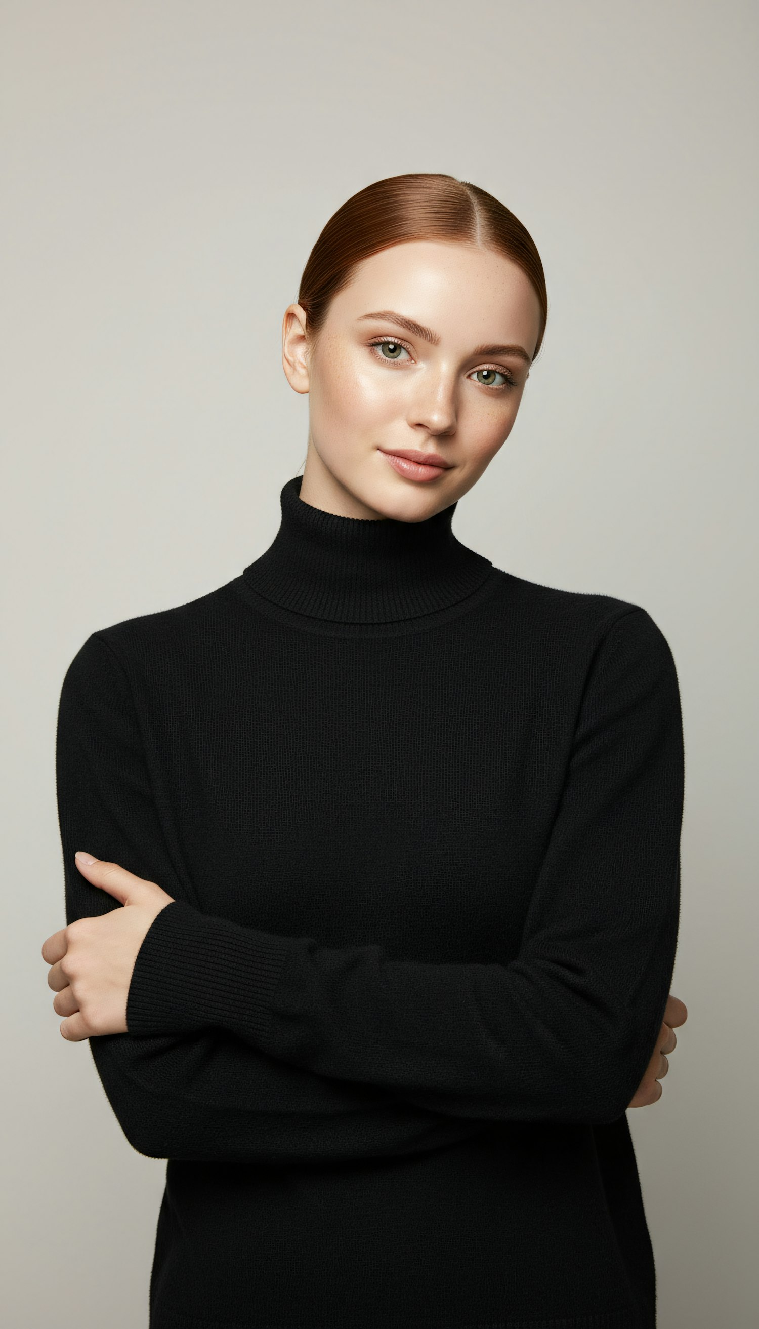 Portrait of a young woman with auburn hair in a bun, wearing a black turtleneck, against a neutral background.