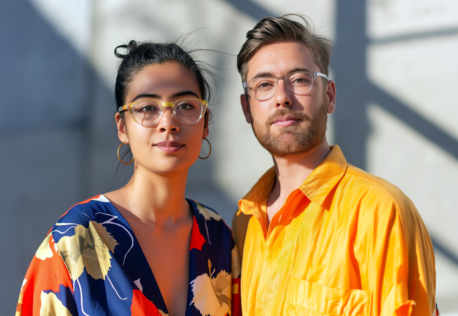 A stylish couple in vibrant outfits and glasses, posing confidently in sunlight with a blurred geometric shadow background.
