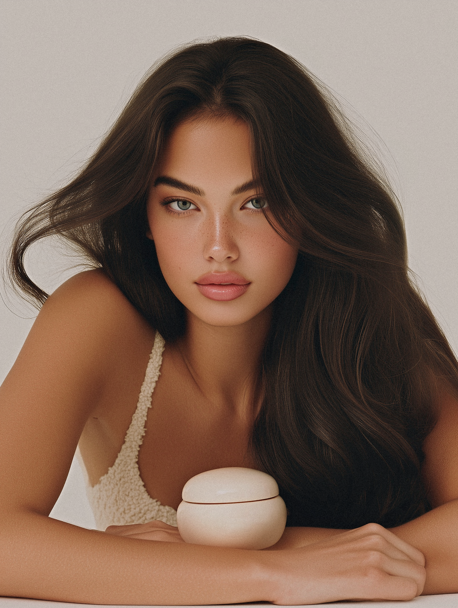 A close-up portrait of a young woman with dark hair and green eyes, leaning on a surface with a cream-colored container in front of her.