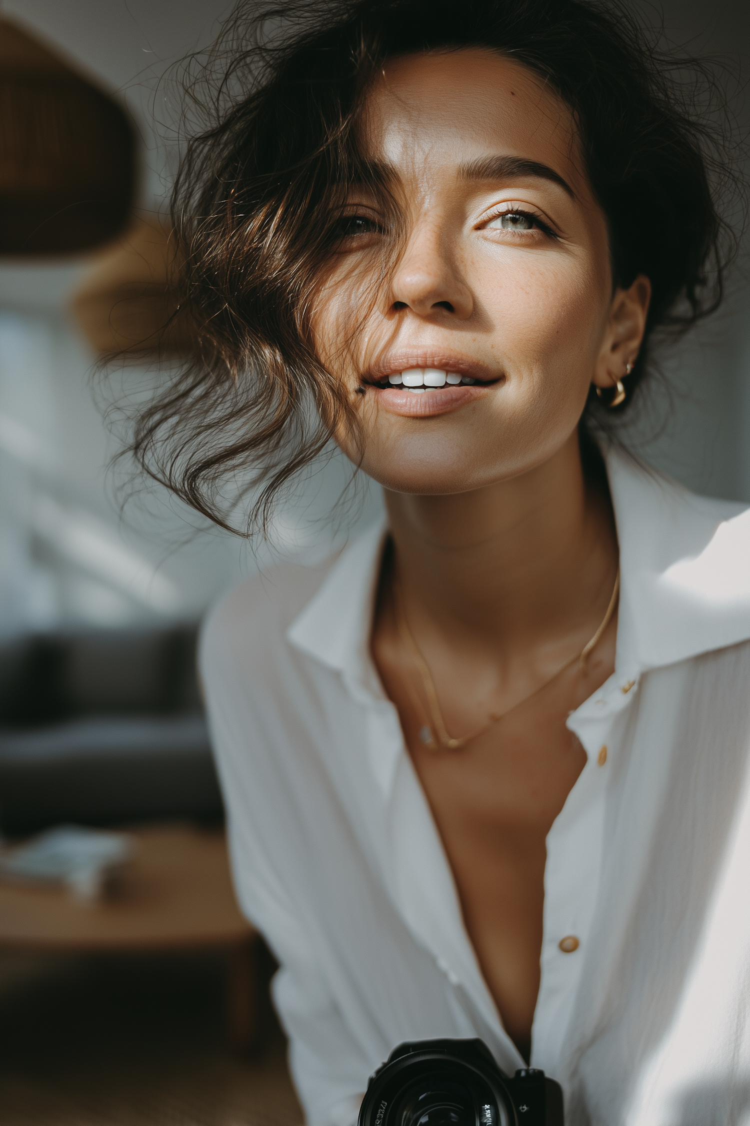 A woman with wavy dark hair and a white shirt smiles softly, holding a camera in a warmly lit, casual setting.