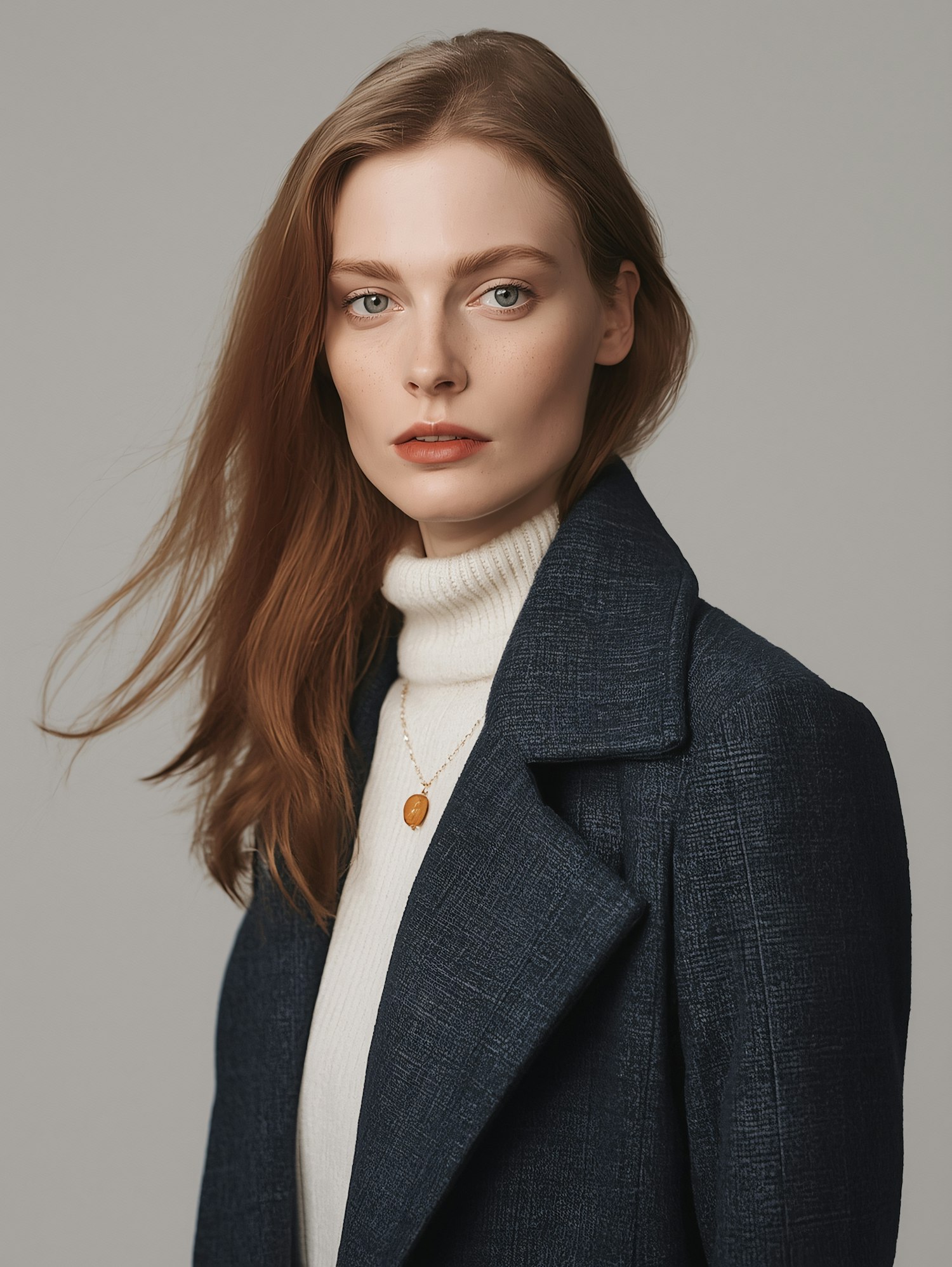 A woman with auburn hair and green eyes wearing a navy coat and white turtleneck, accessorized with a gold necklace, against a gray background.