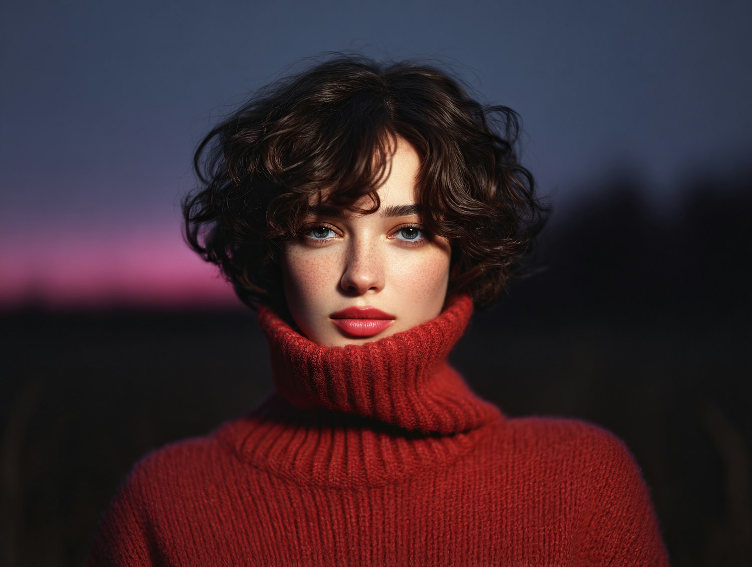 A young woman with curly dark hair and blue eyes in a red sweater against a twilight background, creating a warm and striking portrait.