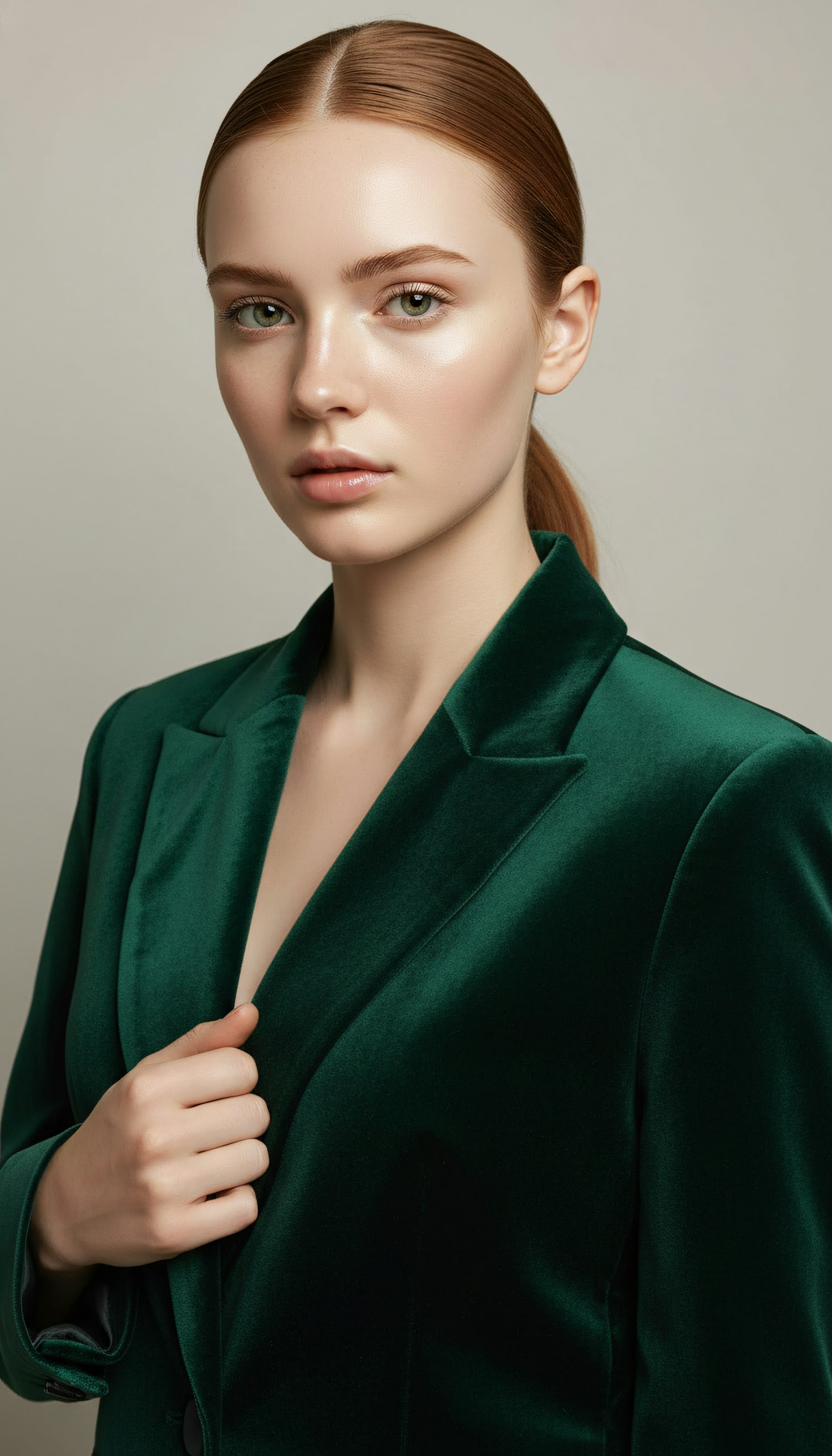 Close-up portrait of a woman with fair skin, green eyes, and auburn hair, wearing a green velvet blazer against a neutral background.