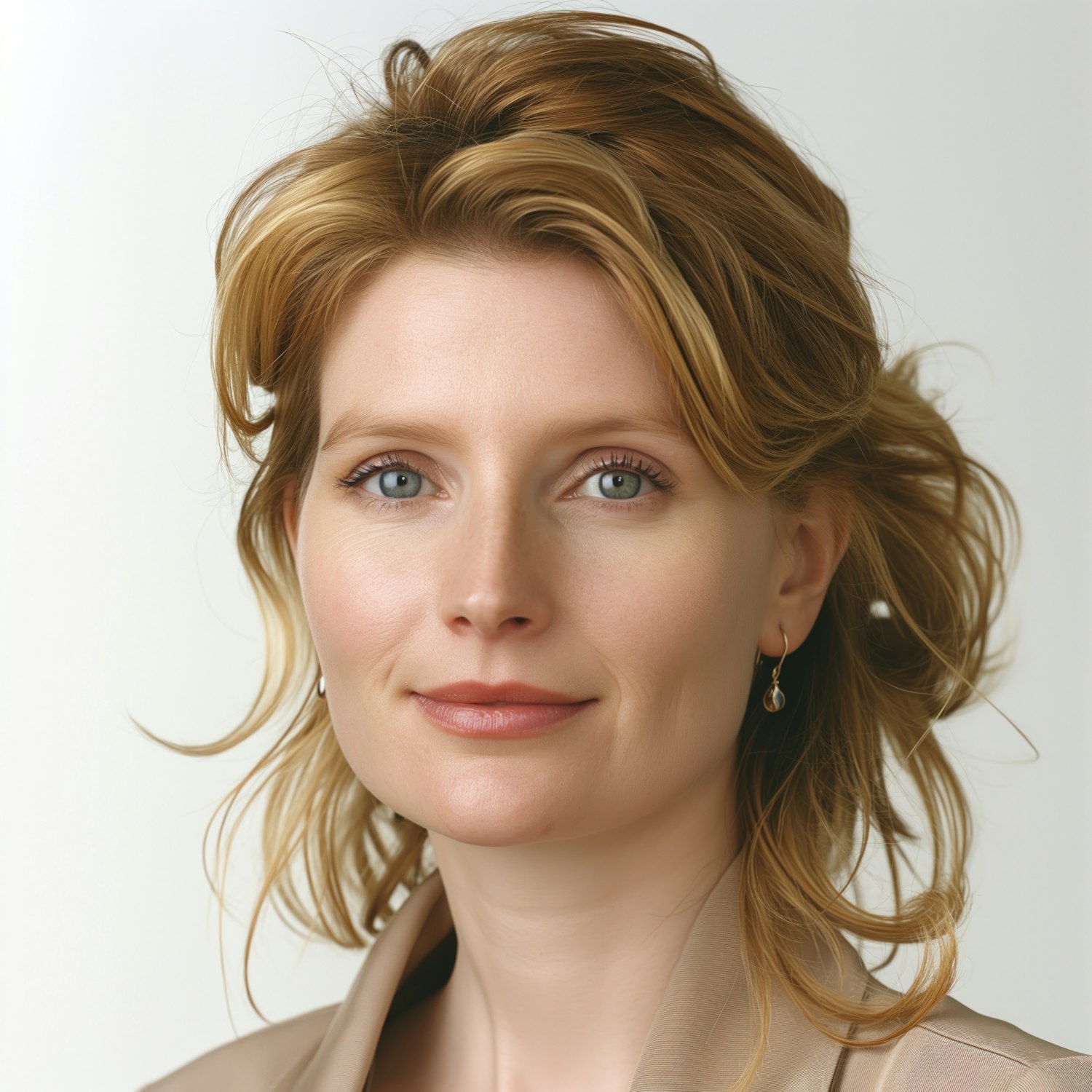 Portrait of a confident woman with light brown hair and blue eyes, wearing a beige blazer and pearl earrings.