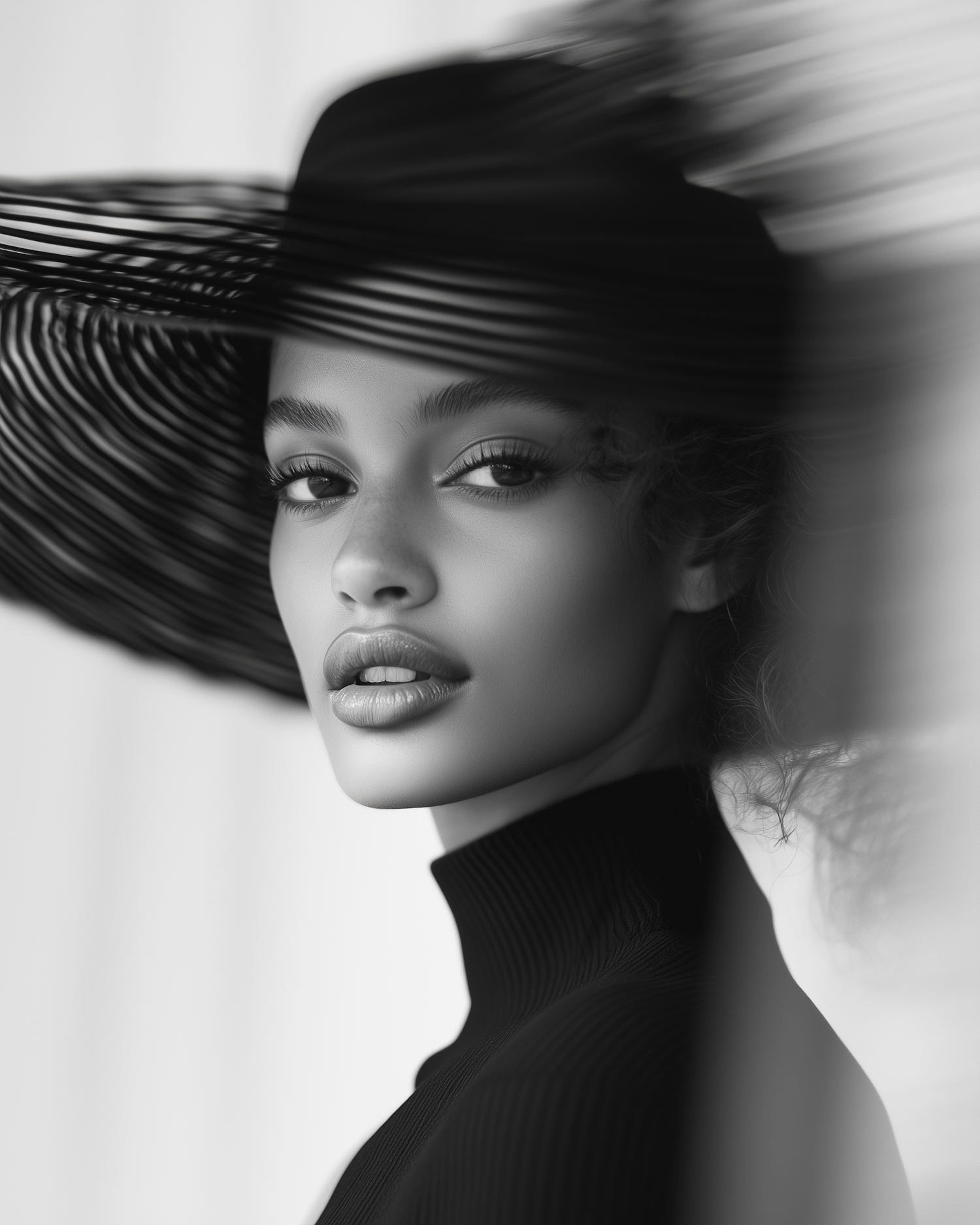 Elegant black and white portrait of a woman in a wide-brimmed hat, showcasing striking features and a captivating expression.