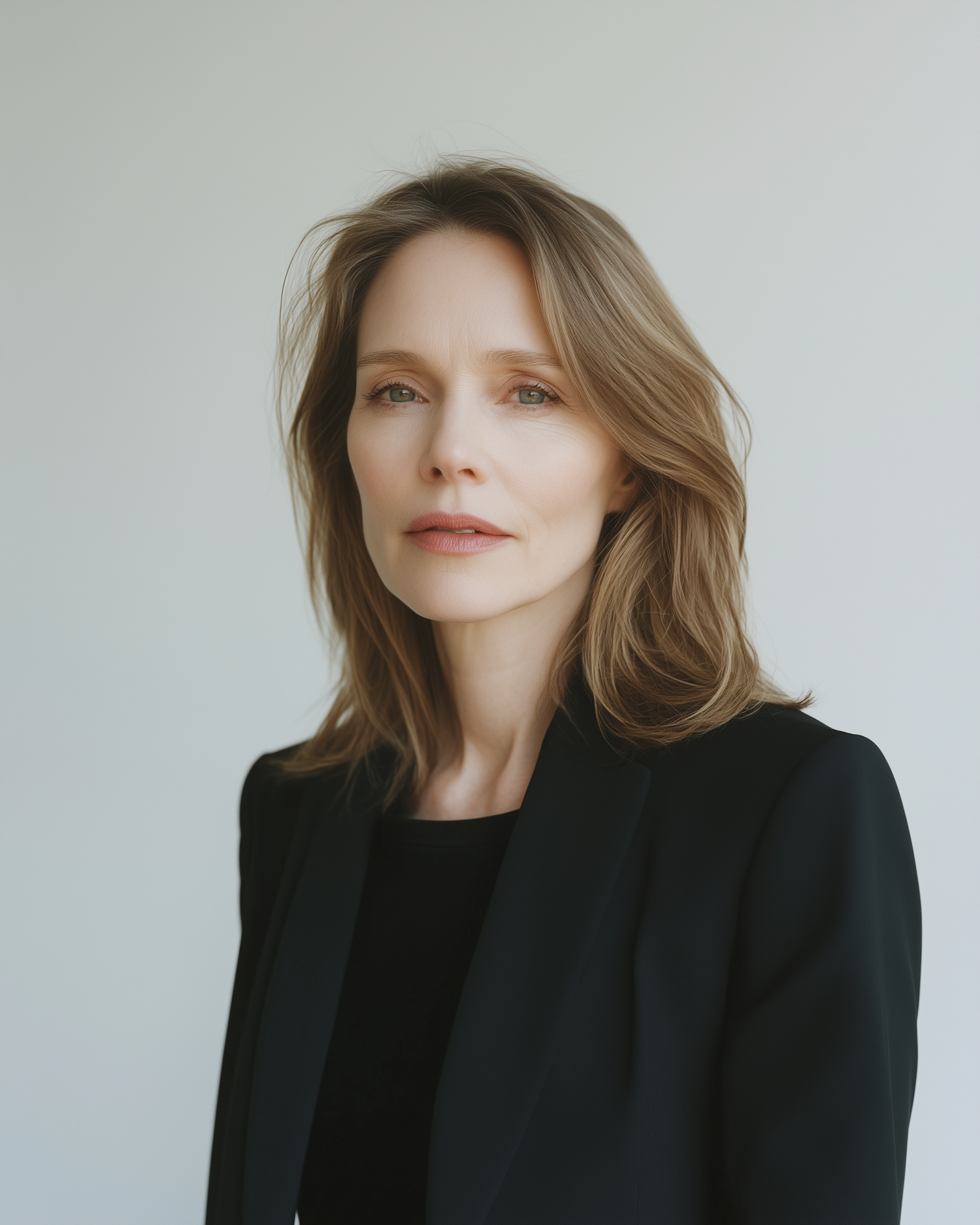 Caucasian woman with light brown hair in a black blazer, neutral expression, soft lighting, plain background.