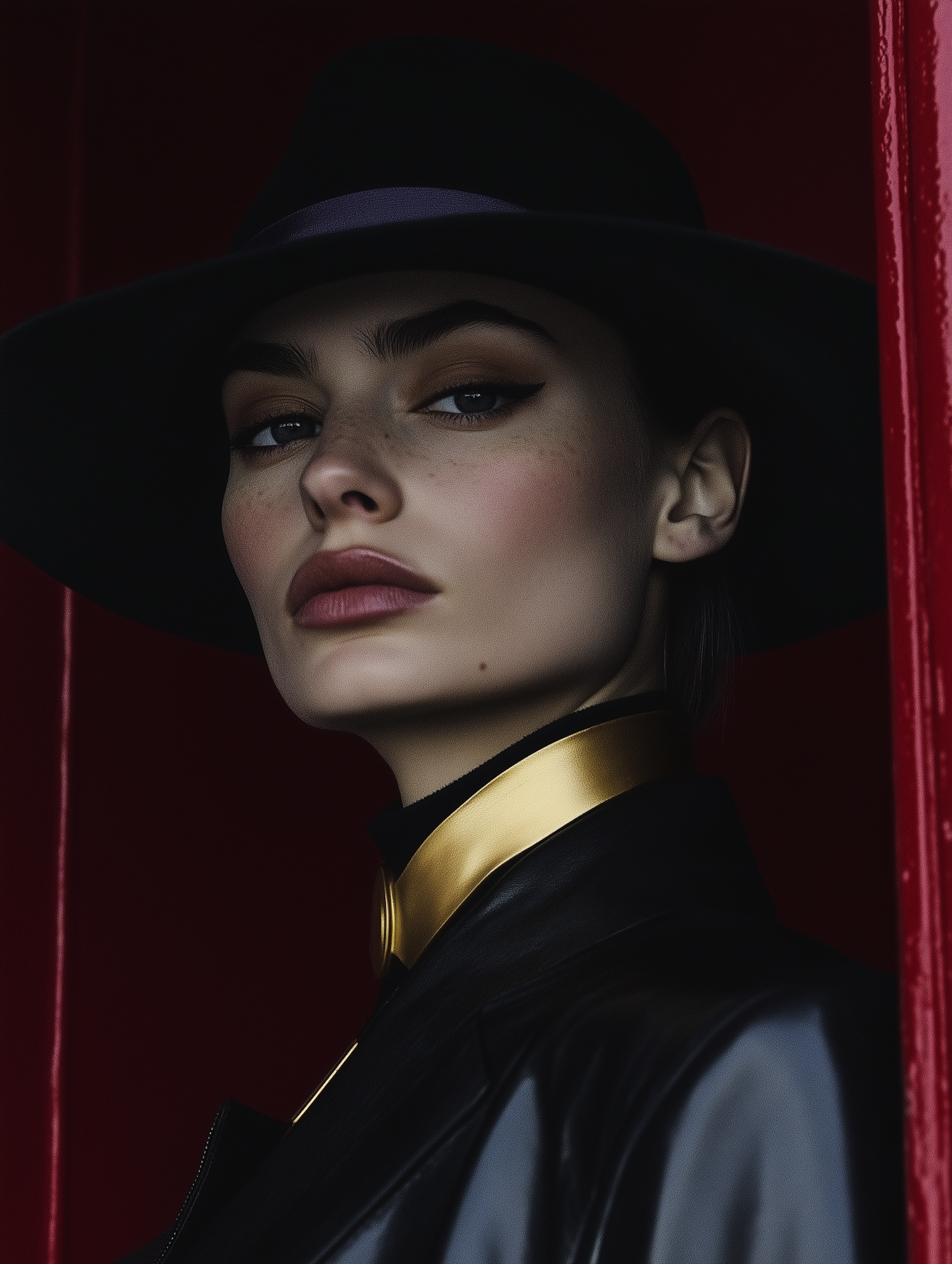 Elegant woman in black hat and leather jacket with gold choker, set against a striking red background.