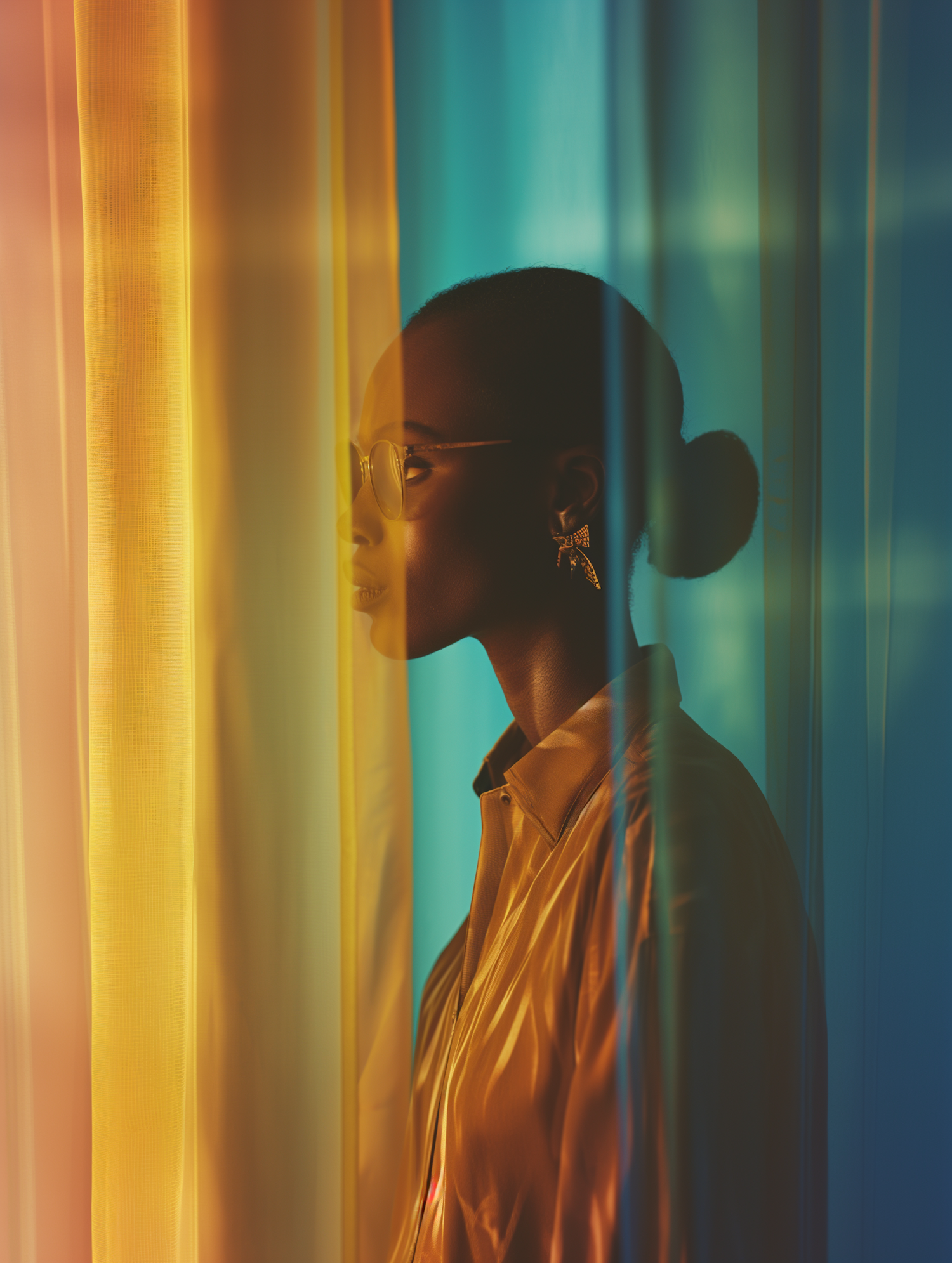 A woman in glasses stands behind a colorful curtain, creating a serene and artistic portrait with warm and cool tones.