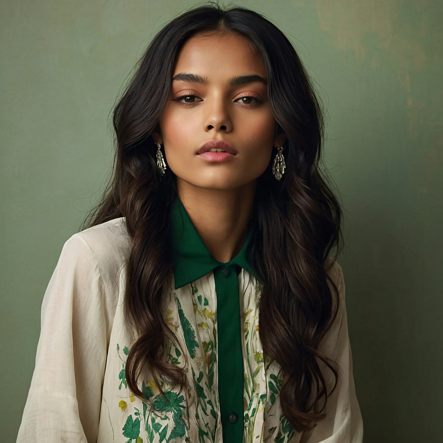 Portrait of a young woman with long dark hair, wearing a floral embroidered blouse and silver earrings against a green background.