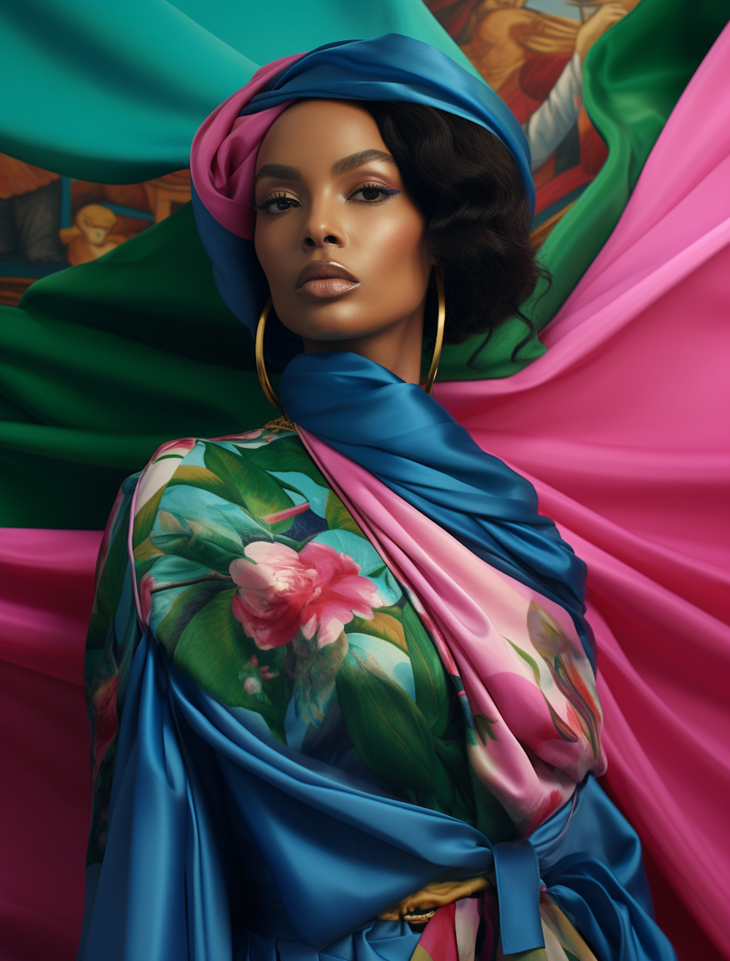 Elegant woman in vibrant headscarf with floral patterns, gold hoop earrings, and colorful flowing fabrics in the background.
