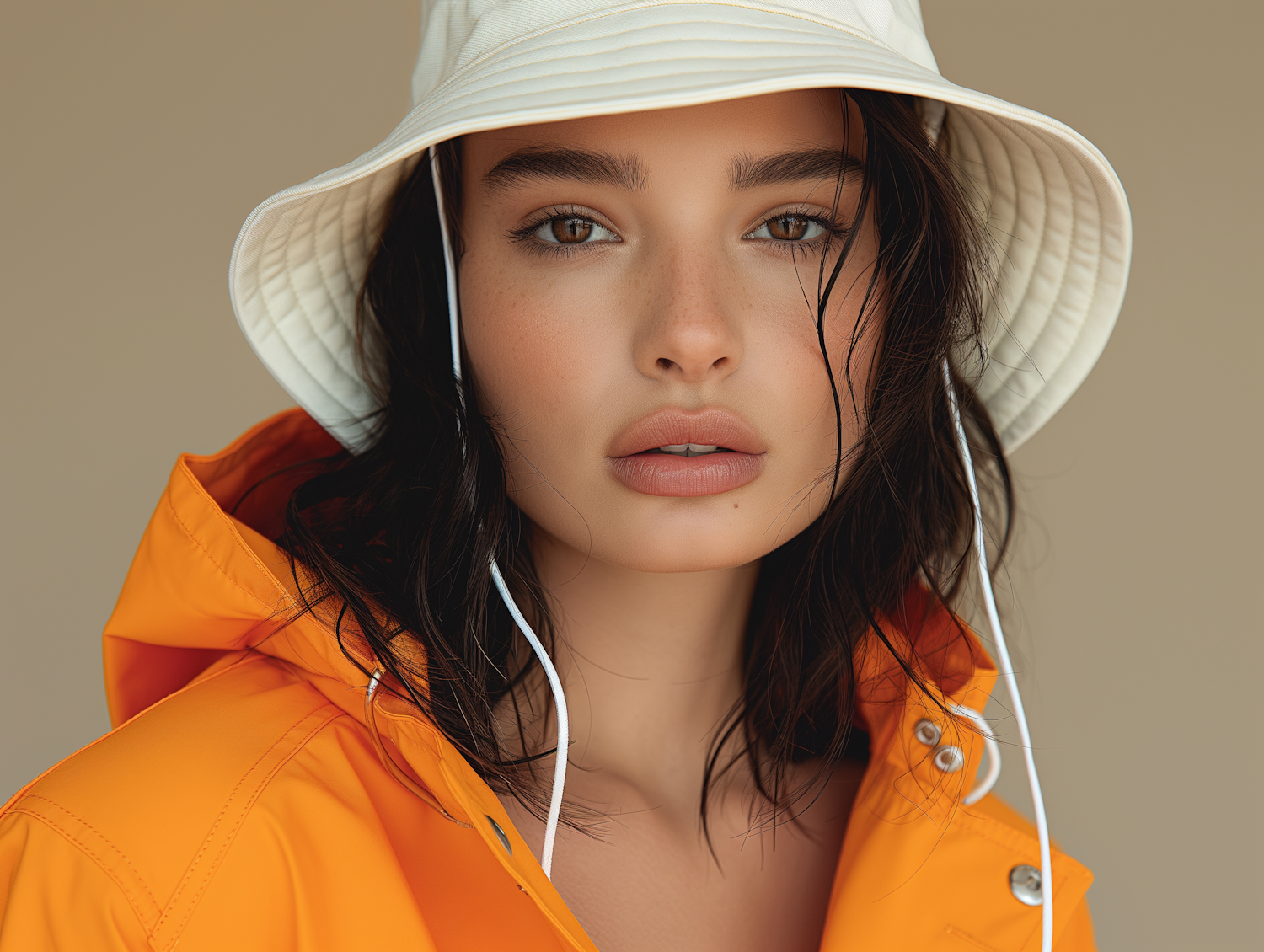Young woman in a white bucket hat and orange raincoat, with wet hair and neutral expression against a beige background.