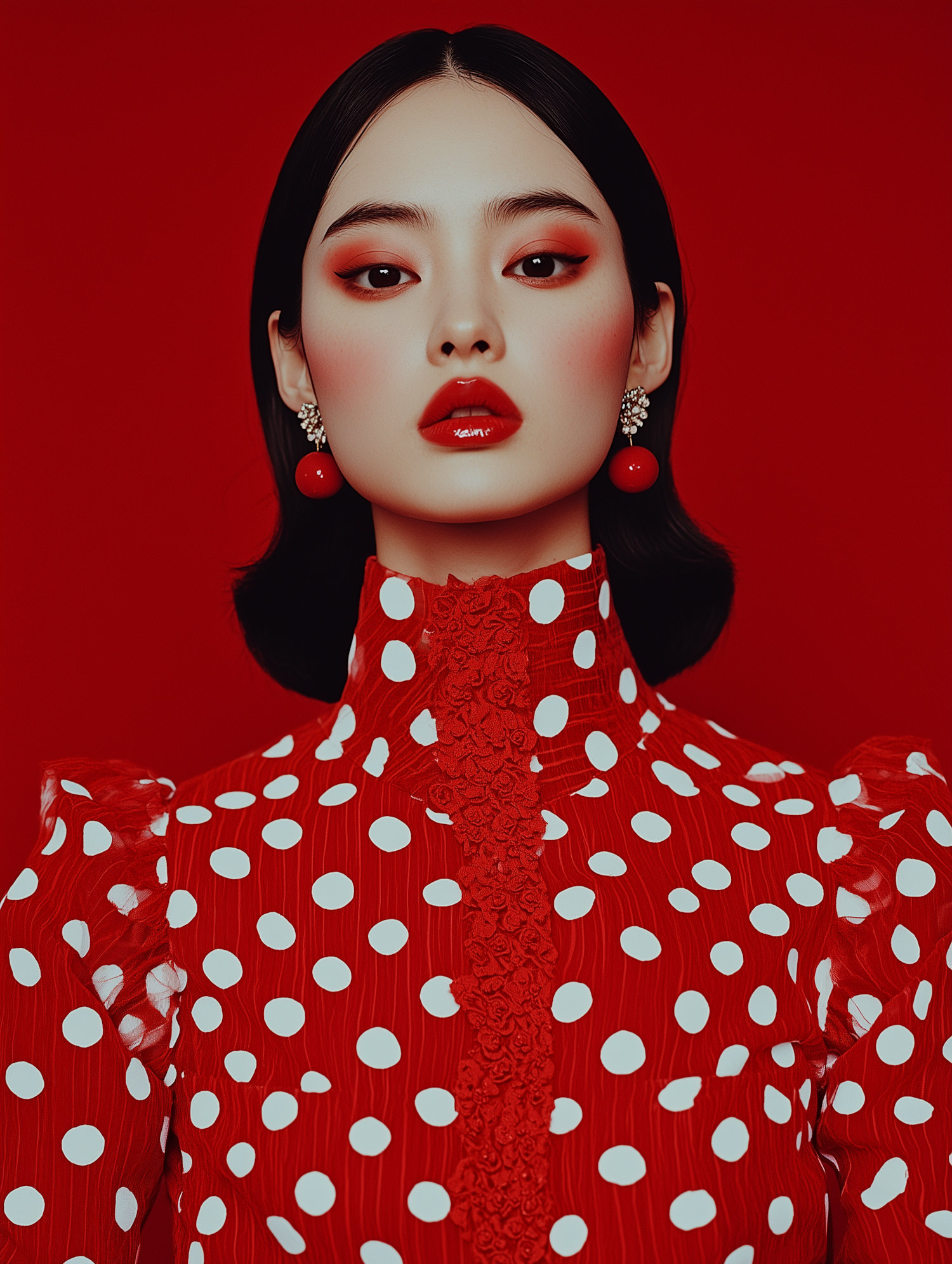 Asian woman in red polka dot dress with bold makeup and earrings against a red background, exuding elegance and confidence.