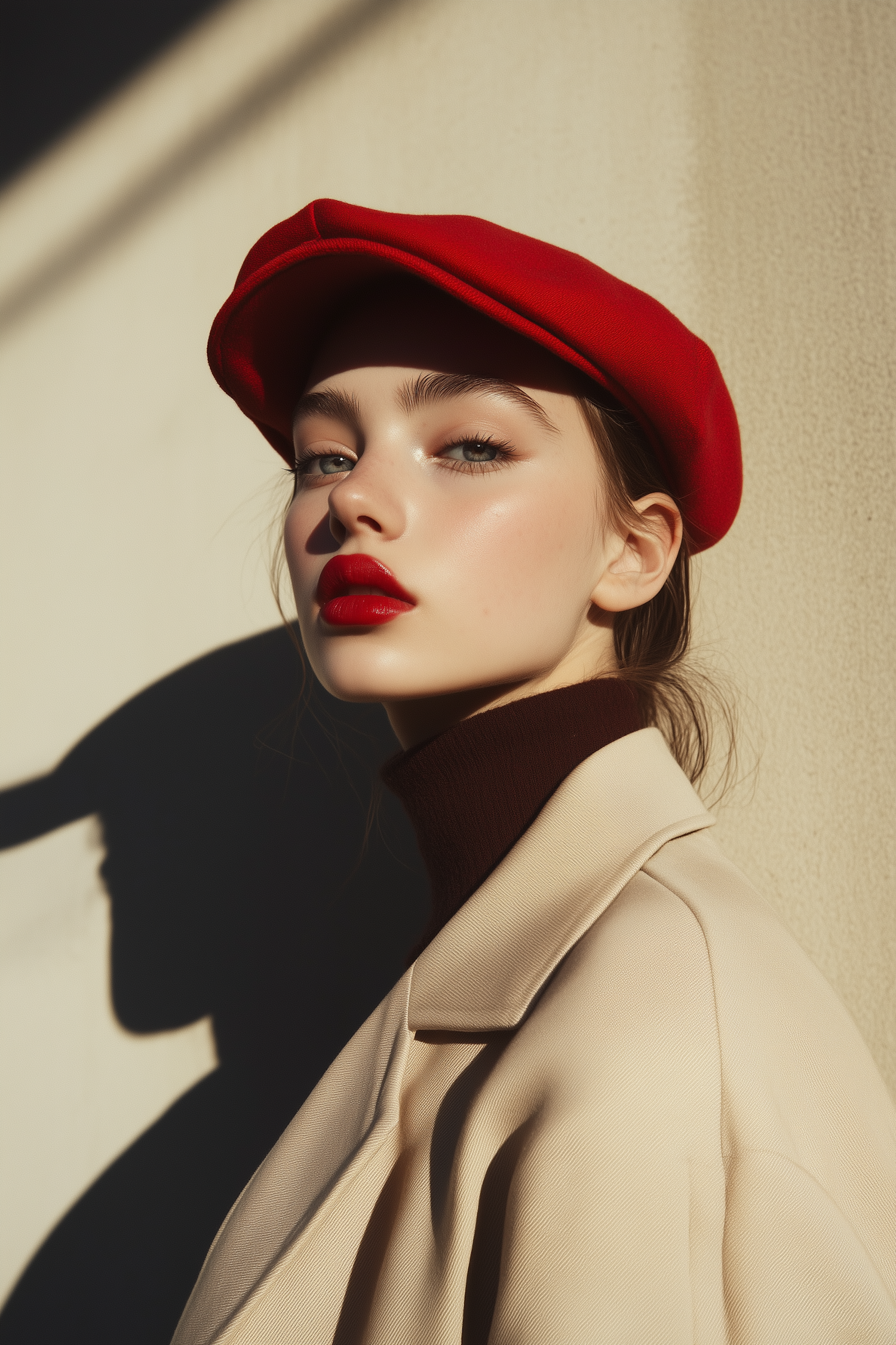 Stylish woman in a red beret and beige trench coat, with bold red lipstick and dramatic sunlight shadows.
