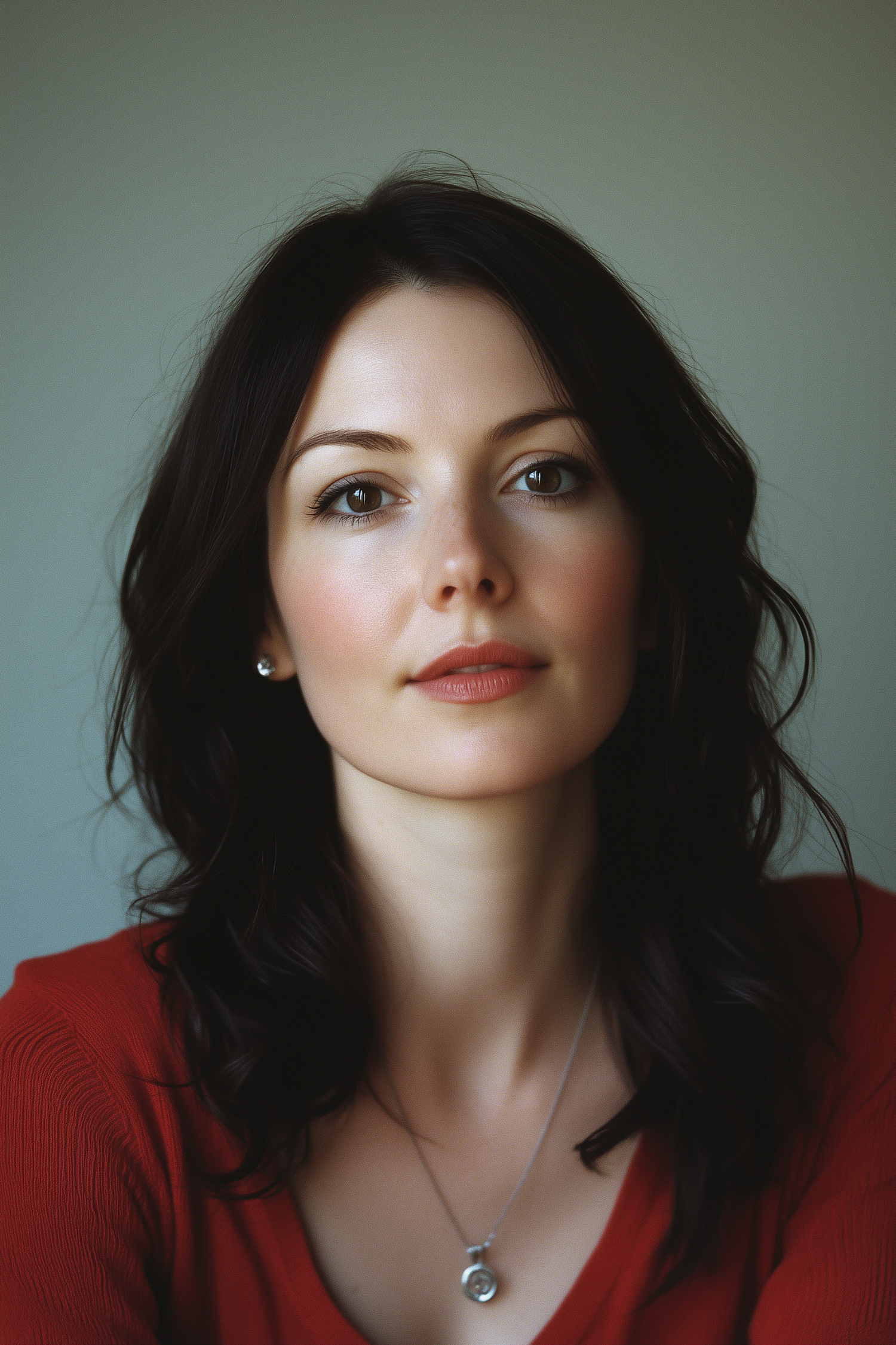Portrait of a woman with dark hair and brown eyes, wearing a red top and silver necklace, set against a muted gray background.