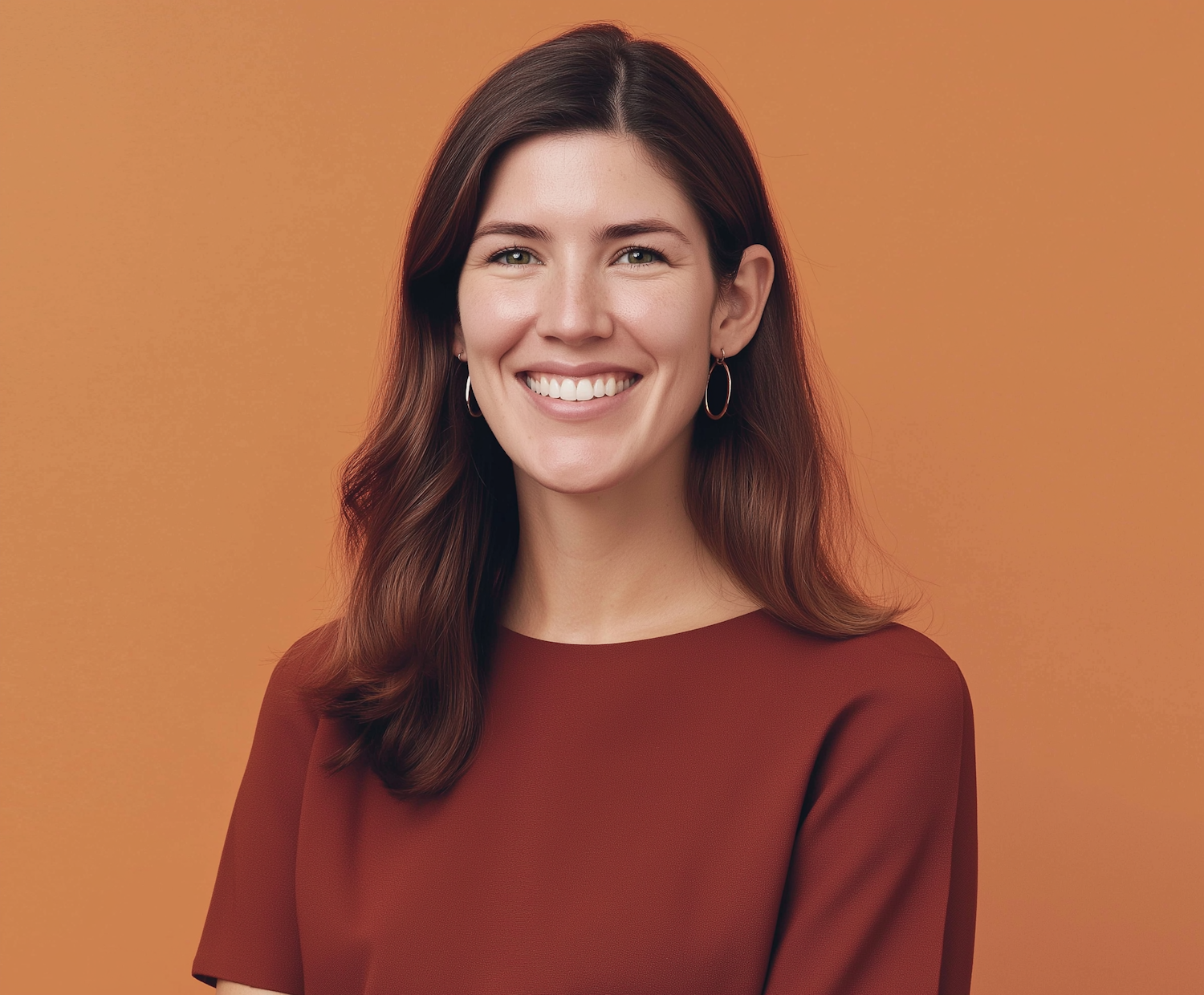 Smiling woman with brown hair and green eyes in a rust top against an orange background, exuding warmth and friendliness.
