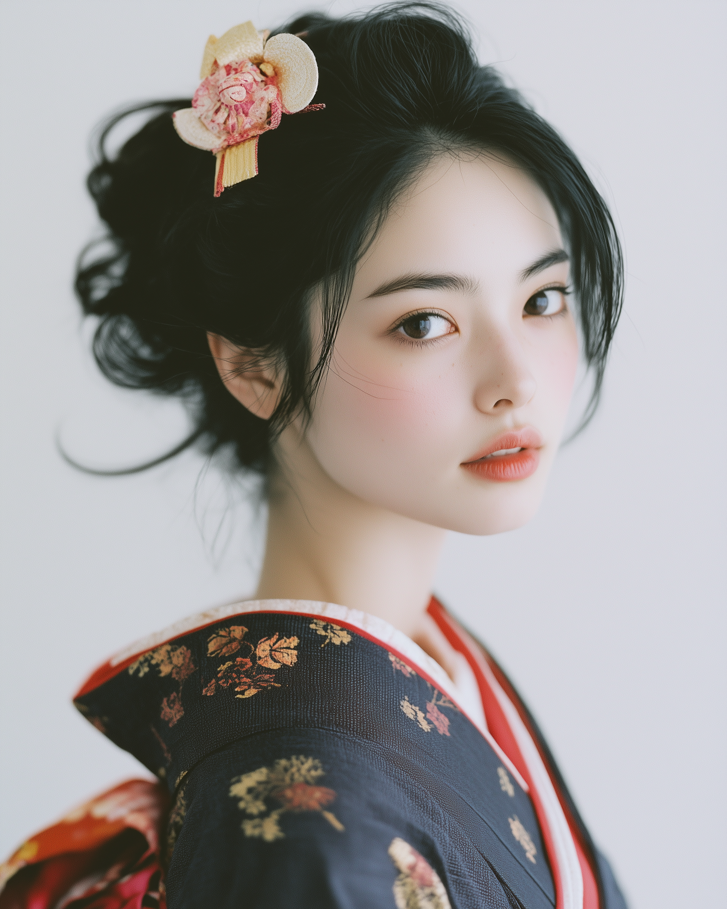 Elegant Asian woman in a floral kimono with a decorative hairpiece, exuding grace and serenity against a light background.